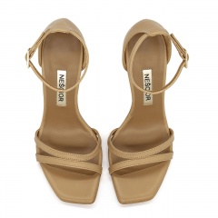 Karmelowe, piękne sandały wyprodukowane z naturalnej skóry licowej. Szpilka w butach wynosi 10 cm. Z przodu umieszczono dwa estetycznie połączone ze sobą cienkie paseczki. Buty zapinane są na regulowany pasek okalający kostkę. Nosek sandałków w kwadrat. Wkładka w butach jest skórzana. Wymiary podawane na kartach produktów to wymiary orientacyjne i odnoszą się do rozmiaru 37.