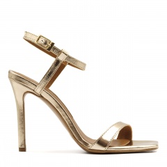 Złote, delikatne skórzane sandały z otwartymi palcami i odkrytą piętą. Buty na wysokiej 10 cm szpilce wykonano z naturalnej skóry. Zapinane są na regulowany pasek okalający kostkę. Nosek w butach jest kwadratowy. Wkładka w sandałach jest skórzana. Wymiary podawane na kartach produktów to wymiary orientacyjne i odnoszą się do rozmiaru 37.