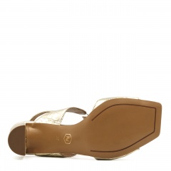Złote skórzane sandały na 7 centymetrowym słupku. Obuwie wykonano ze skóry naturalnej w krokodyli wzór oraz połączenia silikonu z tworzywa. Nosek butów w kwadrat. Wkładki w butach są skórzane. Wymiary podawane na kartach produktów to wymiary orientacyjne i odnoszą się do rozmiaru 37.
