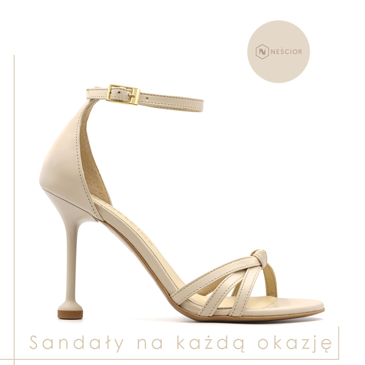 Beżowe sandały na szpilce z odkrytymi palcami i połączonymi ze sobą paseczkami. Buty zostały wykonane ze skóry naturalnej licowej. Smukła 9,5 centymetrowa szpilka nadaje modelowi charakteru, która zakończona jest rozszerzonym flekiem. Obcas jest matowy z tworzywa. Wkładka wykonana jest ze skóry naturalnej. Przód buta w migdał. Wymiary podawane na kartach produktów to wymiary orientacyjne i odnoszą się do rozmiaru 37.