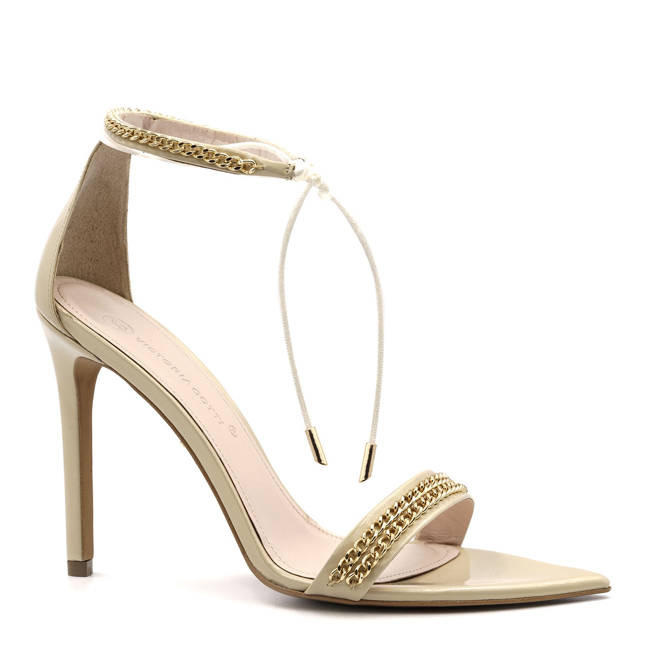 Ecru skórzane sandały na 10,5 cm szpilce. Obuwie wyprodukowano z naturalnej skóry lakierowanej ze złotymi drobinkami. Noski butów w szpic. Do cholewki butów dodano łańcuszki. zakrytą piętę podtrzymują zapinane w kostce sznureczki. Wkładka w sandałach jest skórzana. Wymiary podawane na kartach produktów to wymiary orientacyjne i odnoszą się do rozmiaru 37.