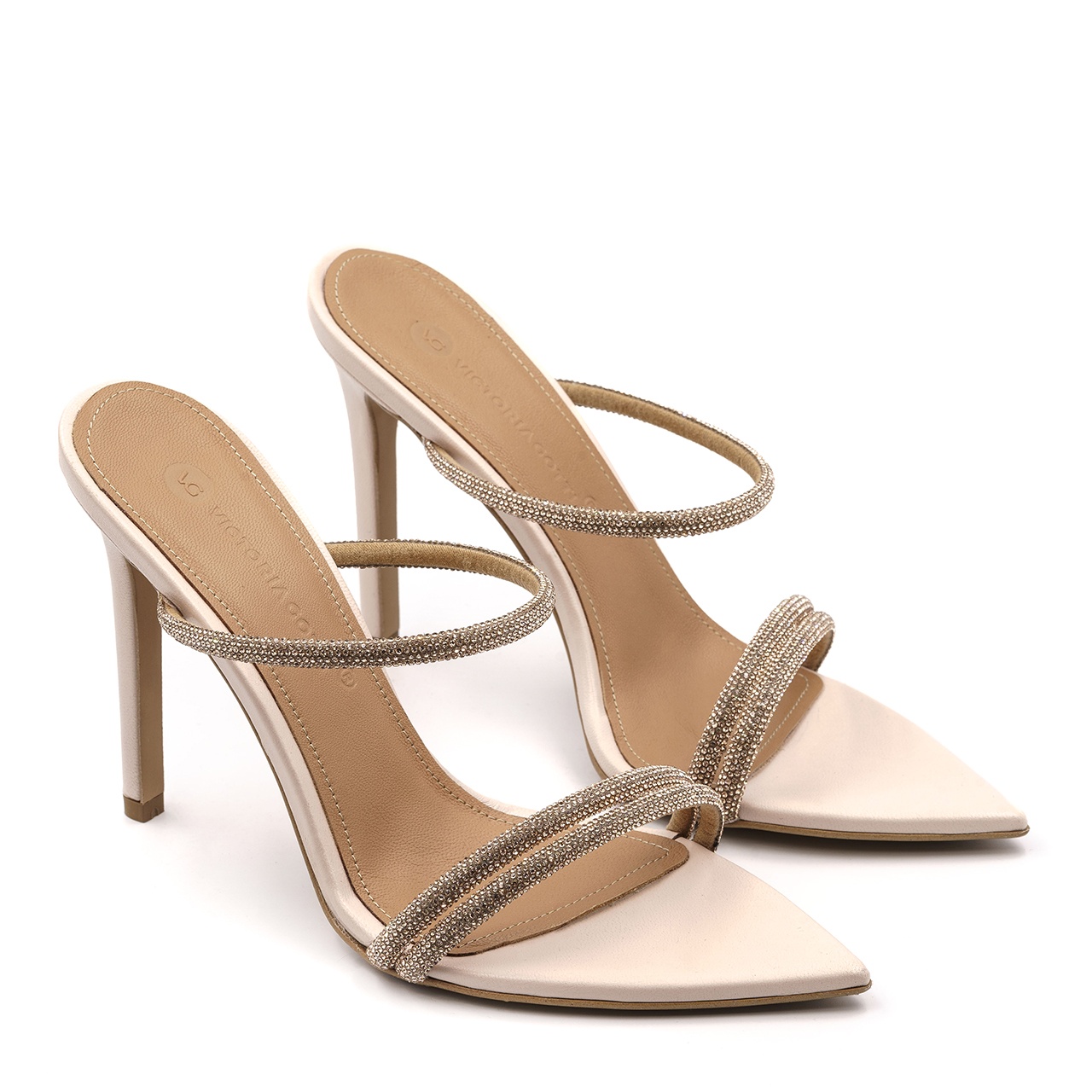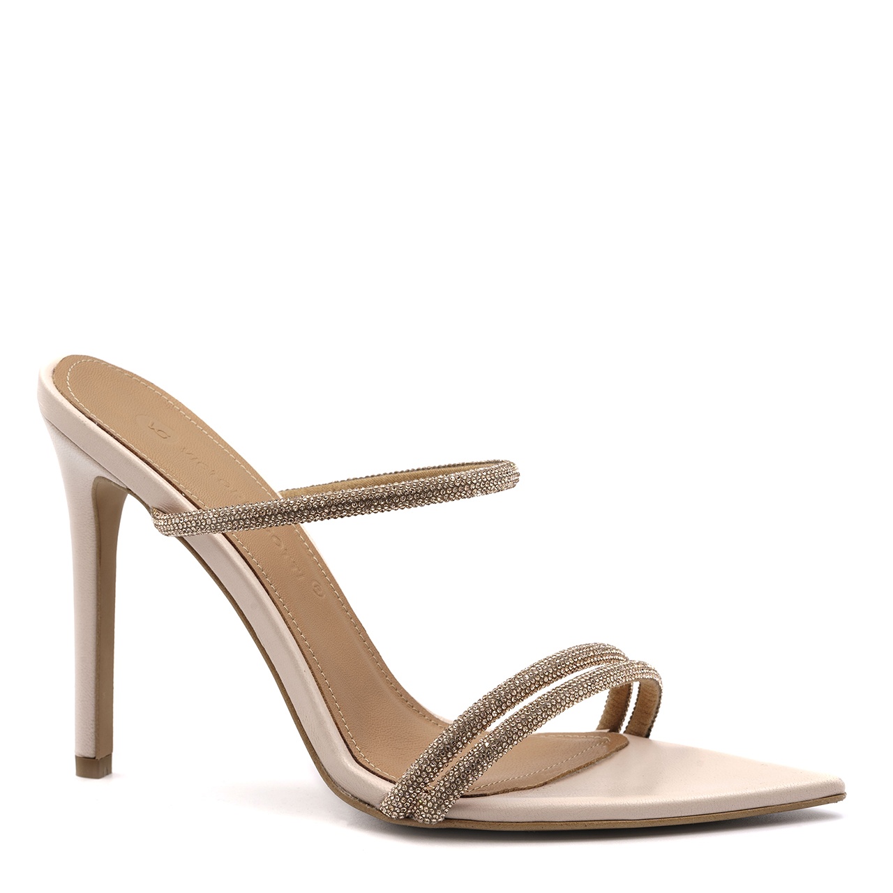 Beżowe klapki na 10,5 cm szpilce. Obuwie wykonano z naturalnej skóry licowej. Sandały posiadają nosek w szpic. Wkładkę wykonano ze skóry naturalnej. Buty posiadają piękne paseczki z błyszczącymi cyrkoniami. Wymiary podawane na kartach produktów to wymiary orientacyjne i odnoszą się do rozmiaru 37.