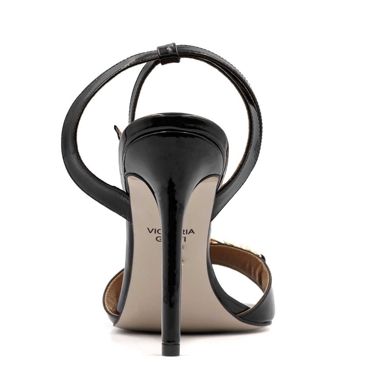 Czarne sandały na 10,5 cm szpilce. Obuwie wykonano z naturalnej skóry lakierowanej. Sandały posiadają nosek w kwadrat. Wkładkę wykonano ze skóry naturalnej. Buty mają odkrytą piętę i zapinane są w kostce. Wyróżnia je łańcuch w kolorze złotym. Wymiary podawane na kartach produktów to wymiary orientacyjne i odnoszą się do rozmiaru 37.