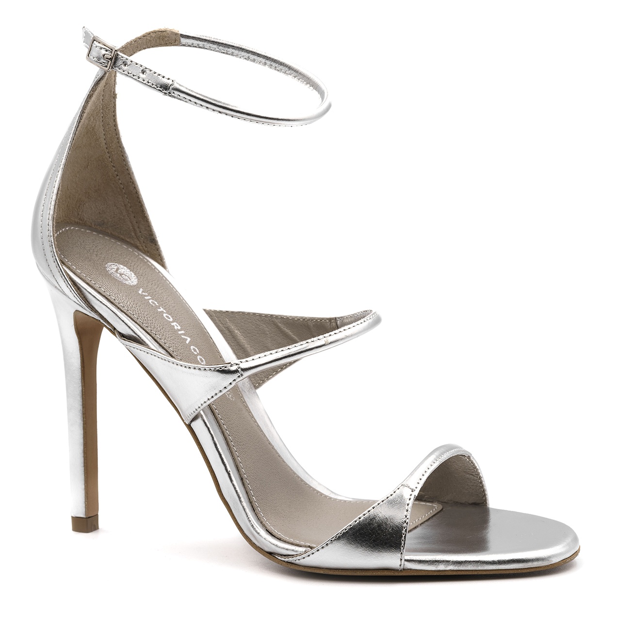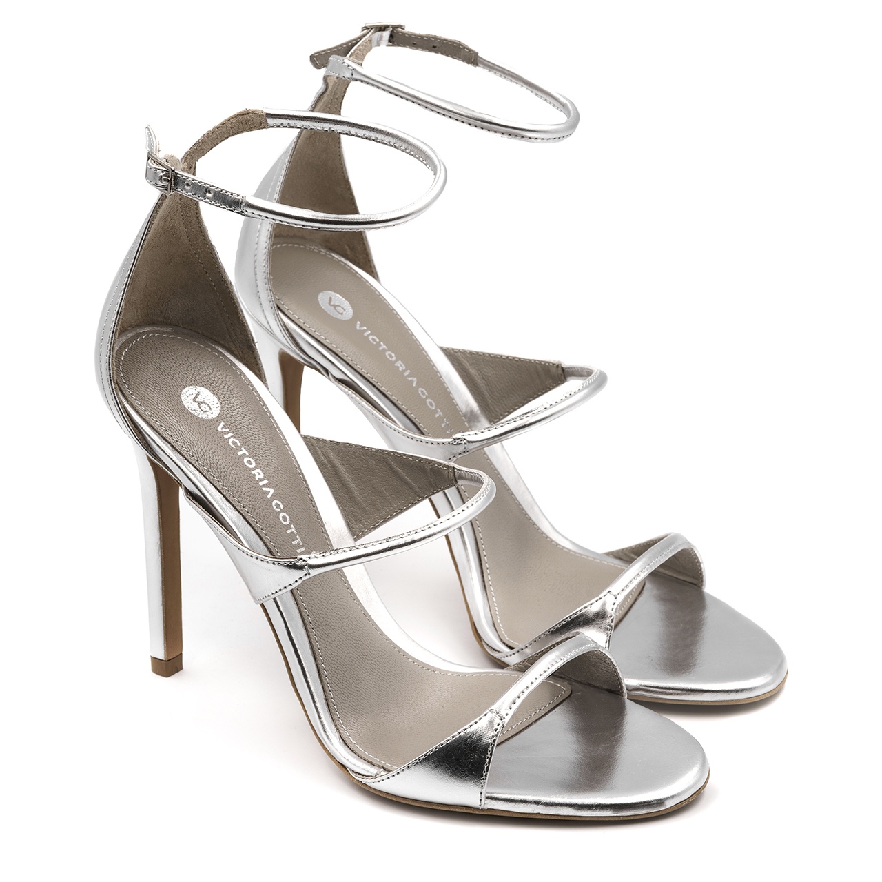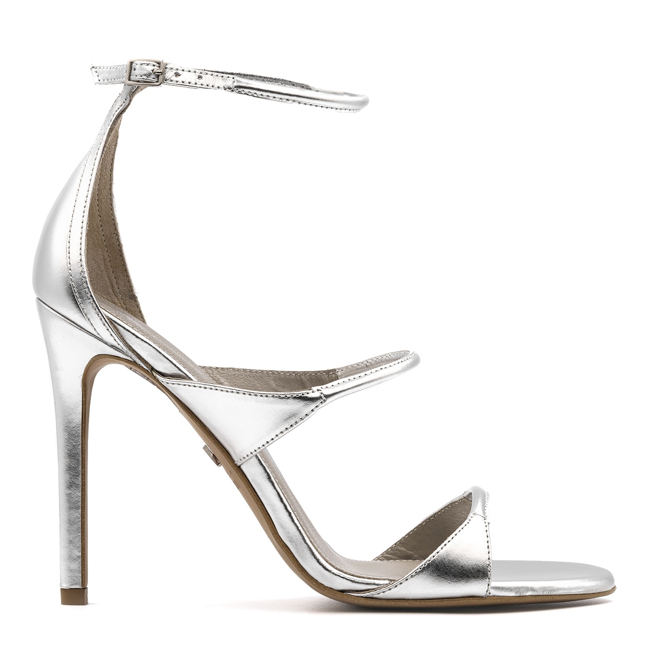 Srebrne, klasyczne szpilki, sandały na wysokiej 11 cm szpilce. Obuwie wykonano z naturalnej skóry. Wkładka jest skórzana. Noski butów okrągłe. Wymiary podawane na kartach produktów to wymiary orientacyjne i odnoszą się do rozmiaru 37.