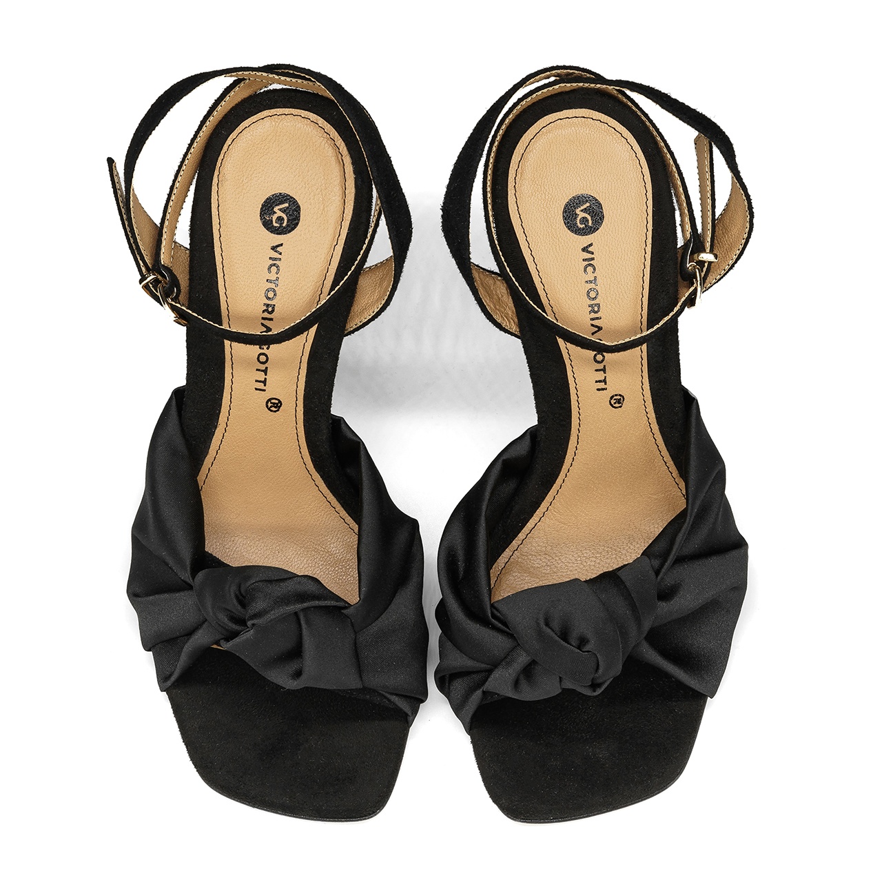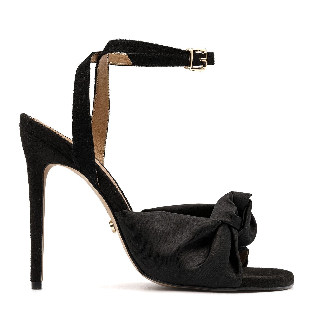 Czarne sandały na 11,5 cm szpilce. Obuwie wyprodukowano z naturalnej skóry zamszowej. Noski butów kwadratowe ozdobione kokadrą. Odkrytą piętę podtrzymują zapinane w kostce skórzane paski. Wkładka w sandałach jest skórzana. Wymiary podawane na kartach produktów to wymiary orientacyjne i odnoszą się do rozmiaru 37.