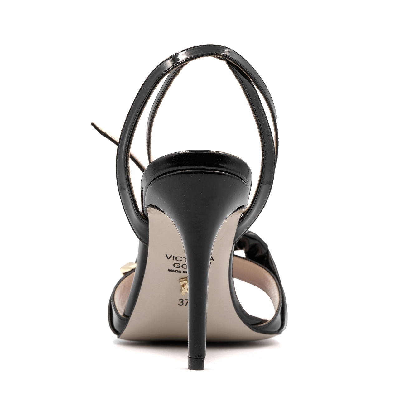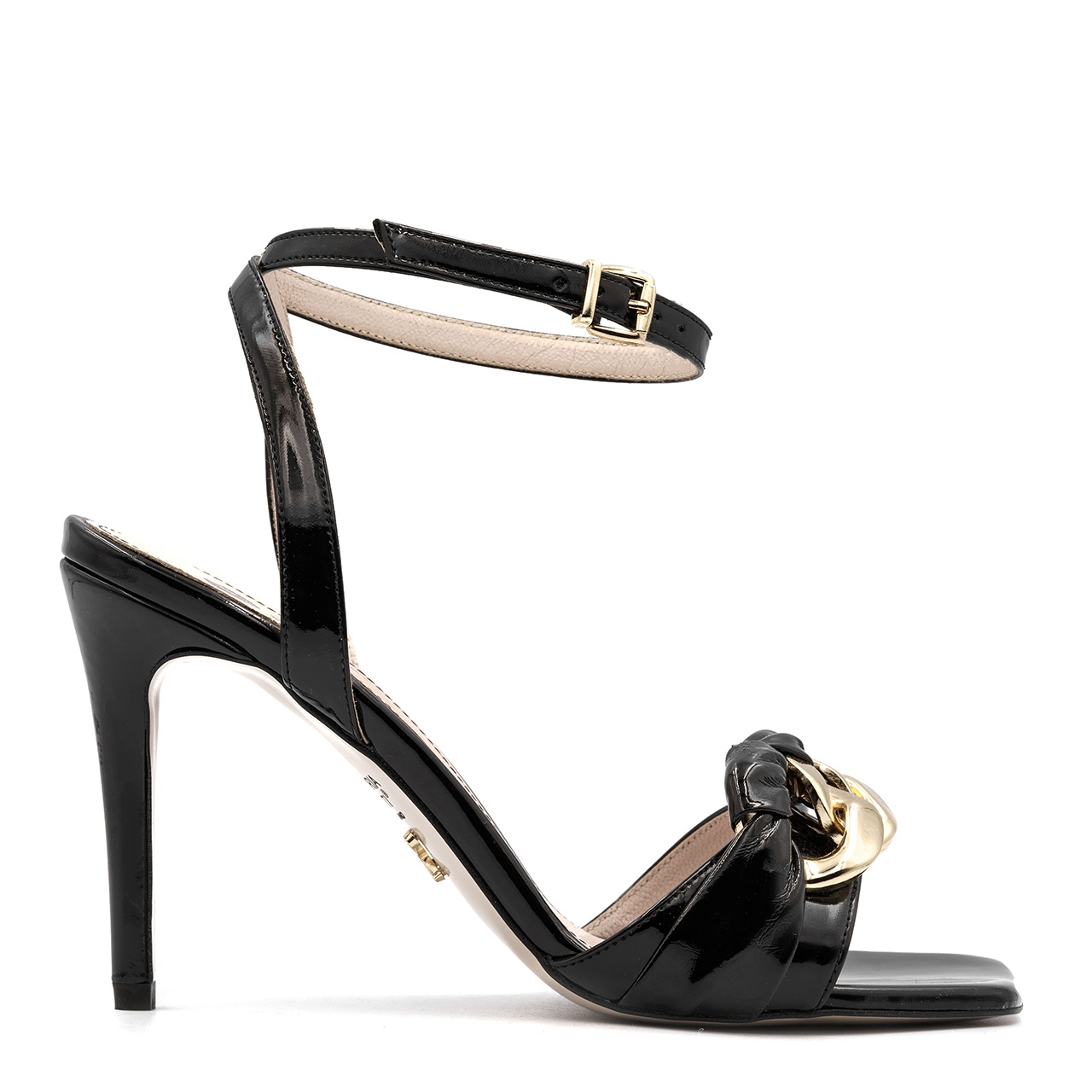 Czarne sandały na 9,5 cm szpilce. Obuwie wyprodukowano z naturalnej skóry lakierowanej. Noski butów w kwadrat. Do cholewki butów dodano gruby, metalowy łańcuch w kolorze złotym. Odkrytą piętę podtrzymują zapinane w kostce skórzane paski. Wkładka w sandałach jest skórzana. Wymiary podawane na kartach produktów to wymiary orientacyjne i odnoszą się do rozmiaru 37.