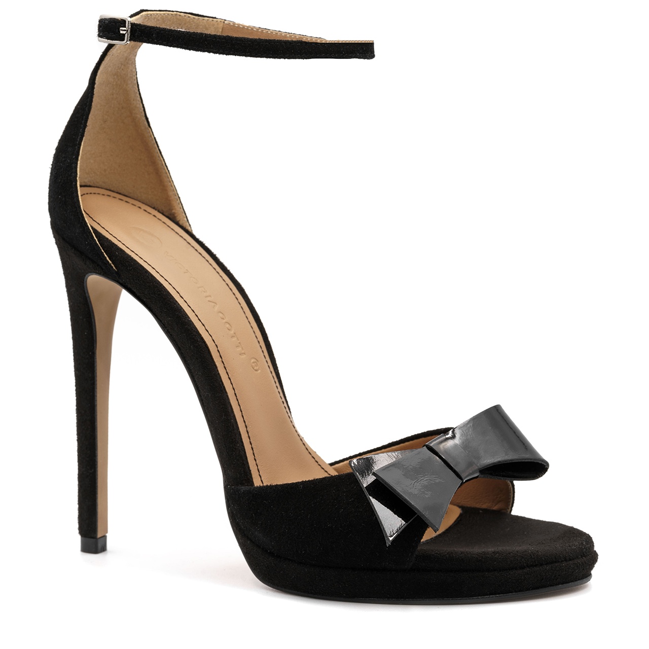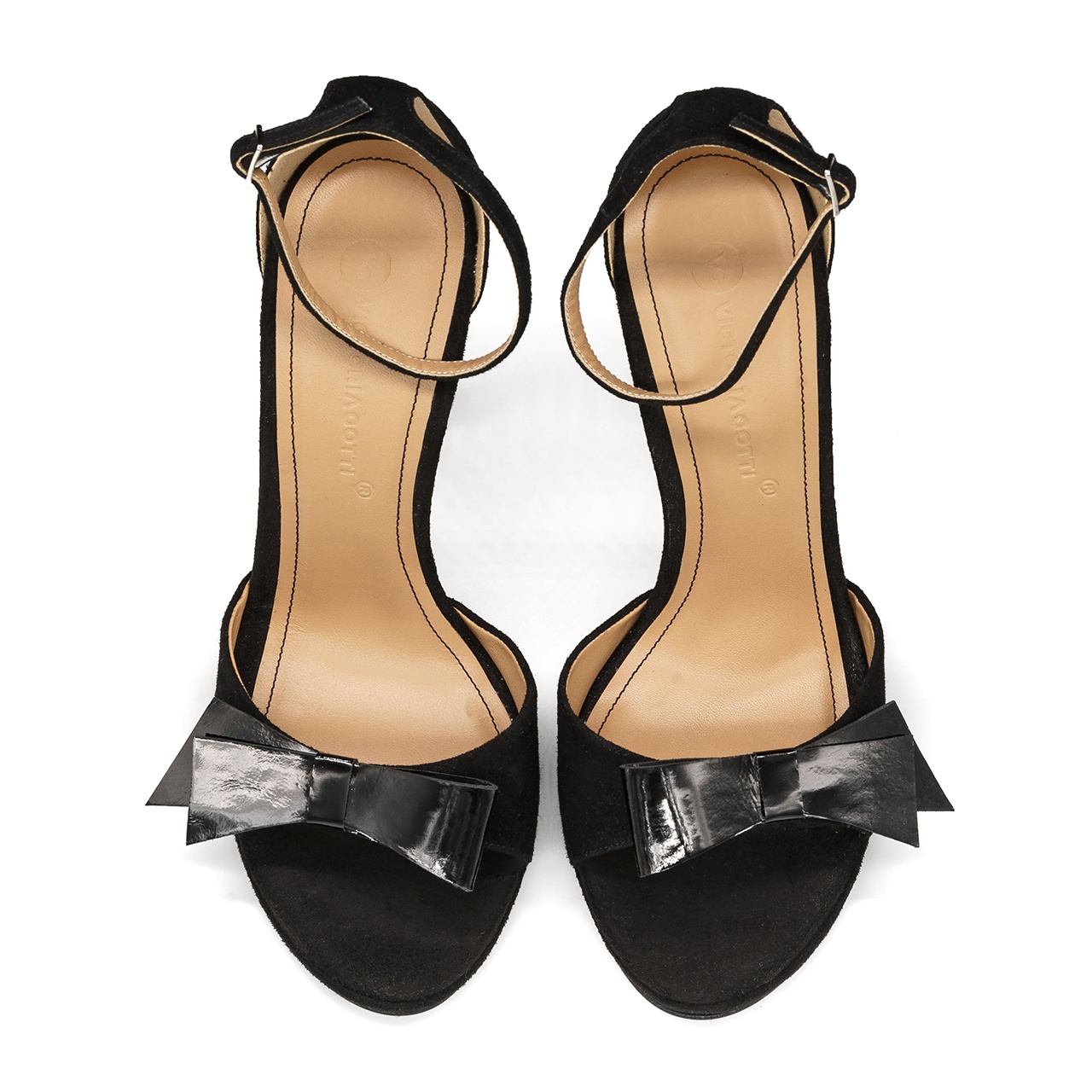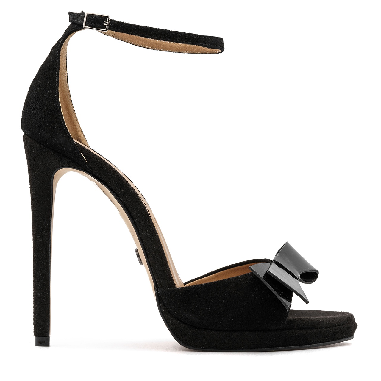 Czarne sandały na 12 cm szpilce i 1 cm platformie. Buty z zakrytą piętą i odkrytymi palcami wykonano z naturalnej skóry zamszowej. Noski butów zaokrąglone. Cholewkę butów ozdobiono kokardą w połysku. Wkładka w butach jest skórzana. Wymiary podawane na kartach produktów to wymiary orientacyjne i odnoszą się do rozmiaru 37.