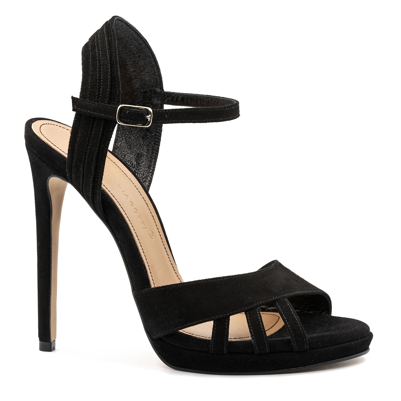 Czarne zamszowe sandały, szpilki na 12 cm szpilce i 1 cm platformie. Obuwie zostało wykonane ze skóry zamszowej. Pasek zapinany na sprzączkę powoduje dopasowanie się do stopy. Wkładka wykonana jest ze skóry naturalnej. Przód buta okrągły. Wymiary podawane na kartach produktów to wymiary orientacyjne i odnoszą się do rozmiaru 37.