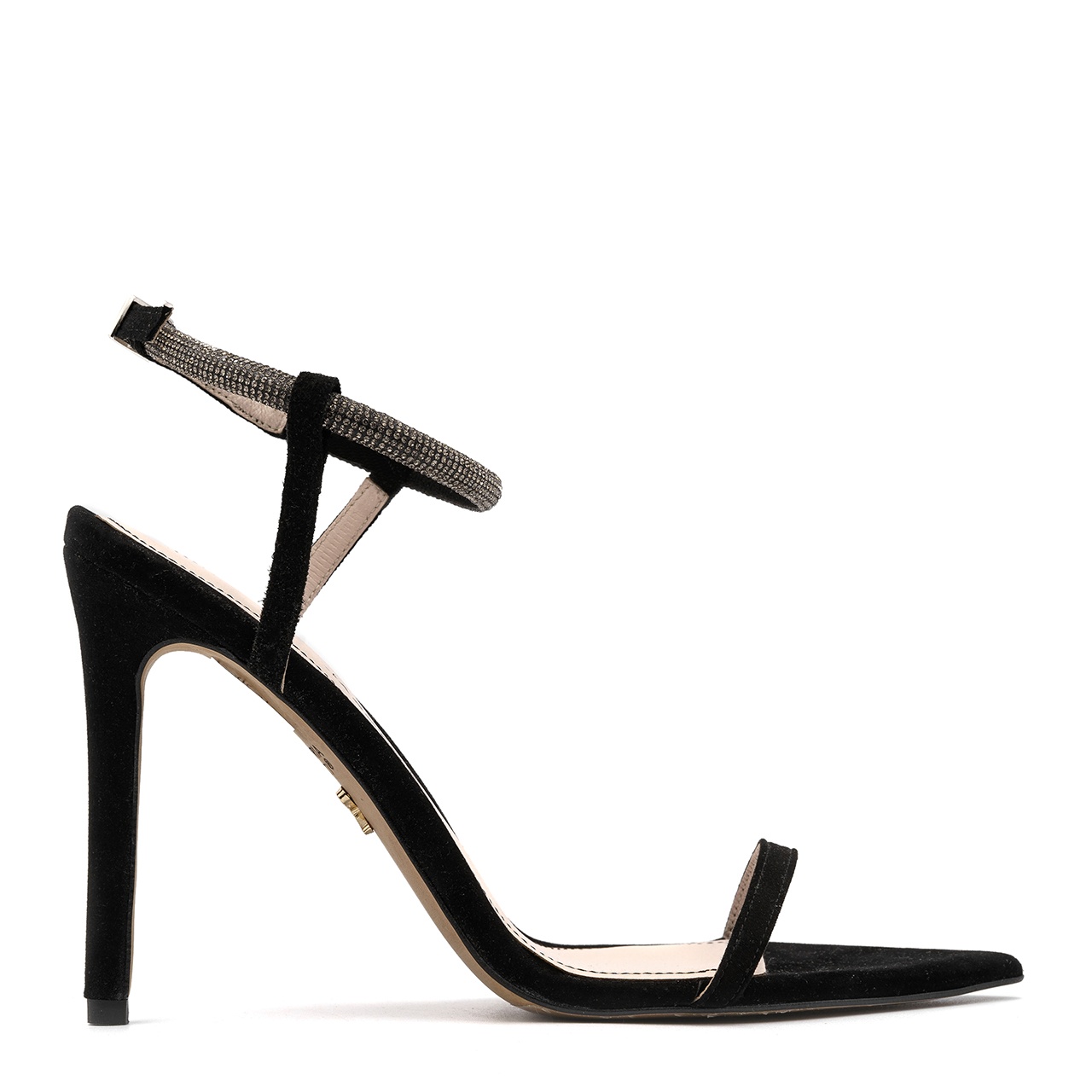 Czarne sandały na 11 cm szpilce, wykonano z naturalnej skóry zamszowej. Sandały posiadają nosek w szpic. Wkładkę wykonano ze skóry naturalnej. Buty mają odkrytą piętę i zapinane są w kostce. Wyróżnia je błyszczący pasek. Wymiary podawane na kartach produktów to wymiary orientacyjne i odnoszą się do rozmiaru 37.