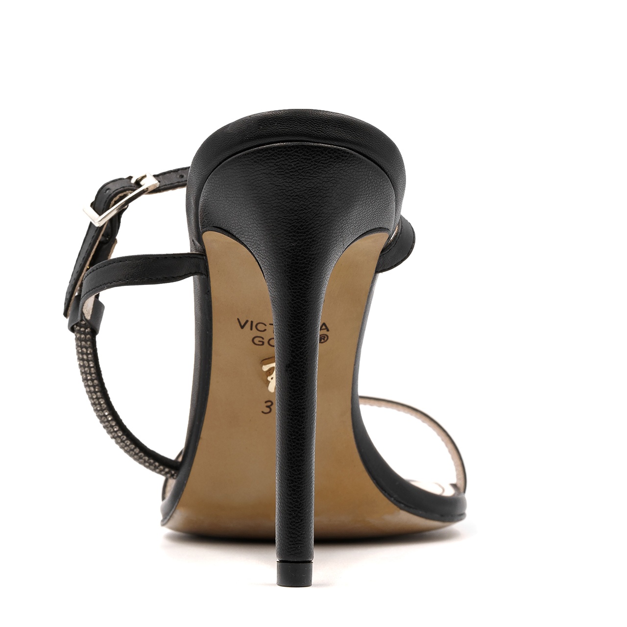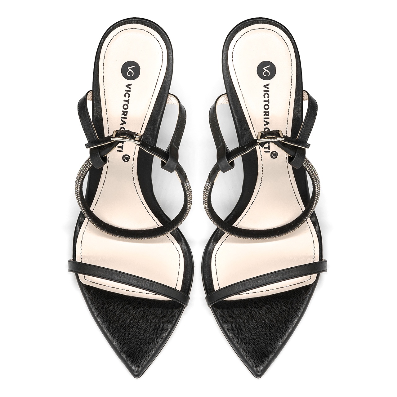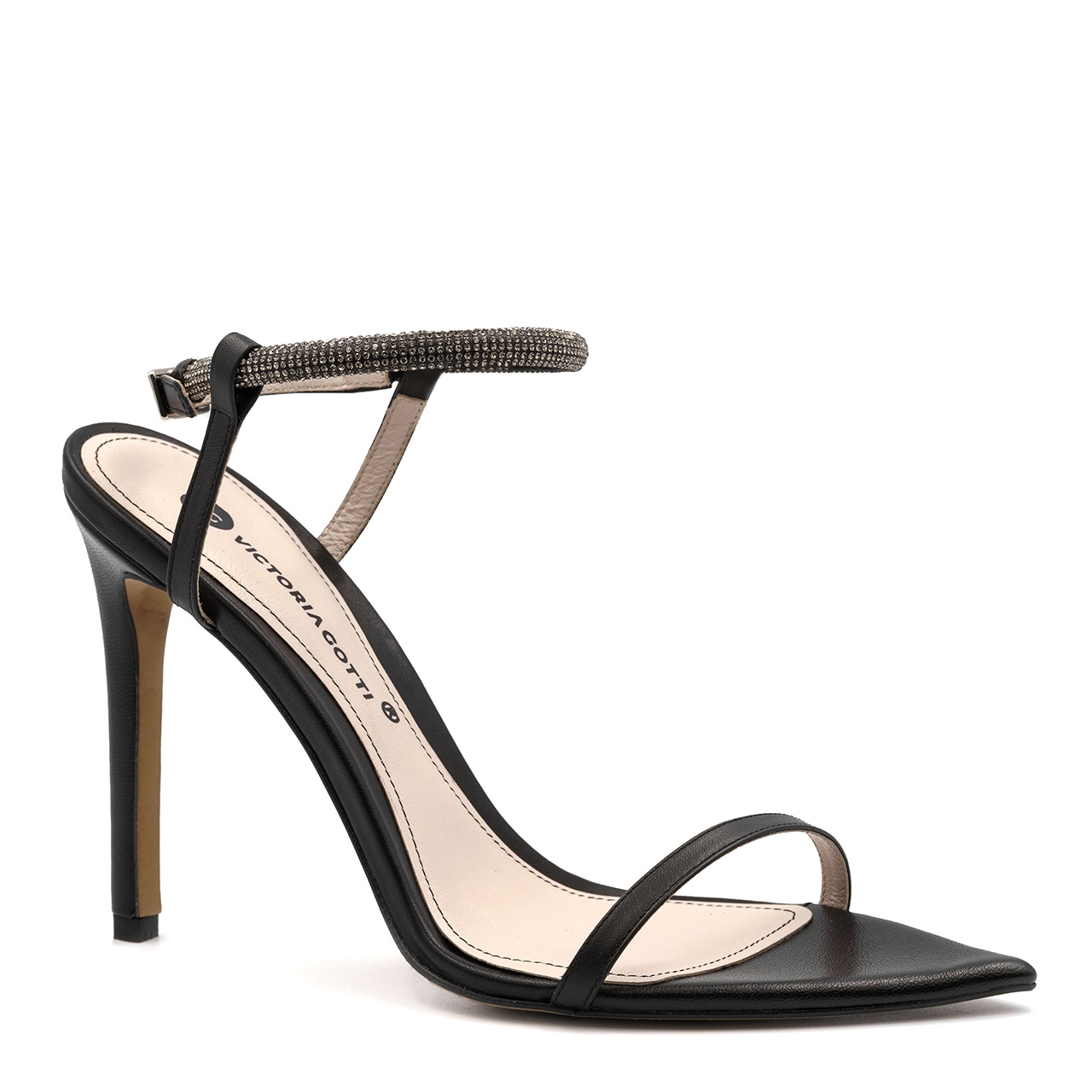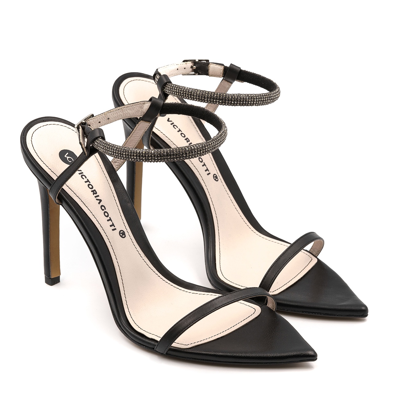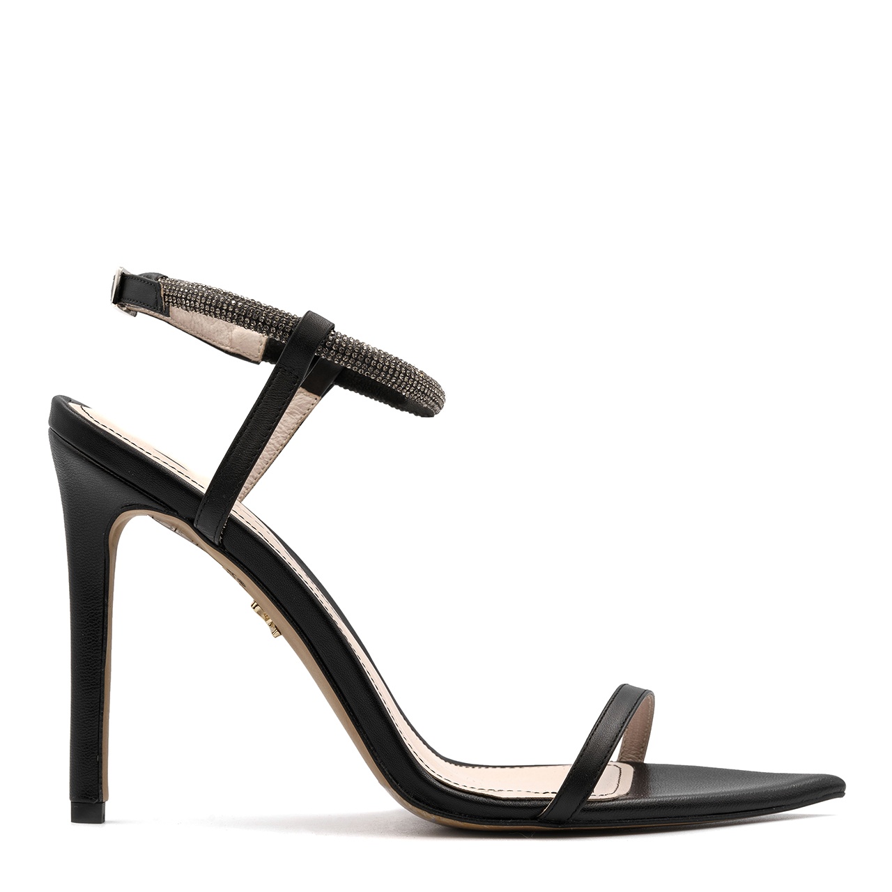 Czarne sandały na 11 cm szpilce, wykonano z naturalnej skóry licowej. Sandały posiadają nosek w szpic. Wkładkę wykonano ze skóry naturalnej. Buty mają odkrytą piętę i zapinane są w kostce. Wyróżnia je błyszczący pasek. Wymiary podawane na kartach produktów to wymiary orientacyjne i odnoszą się do rozmiaru 37.