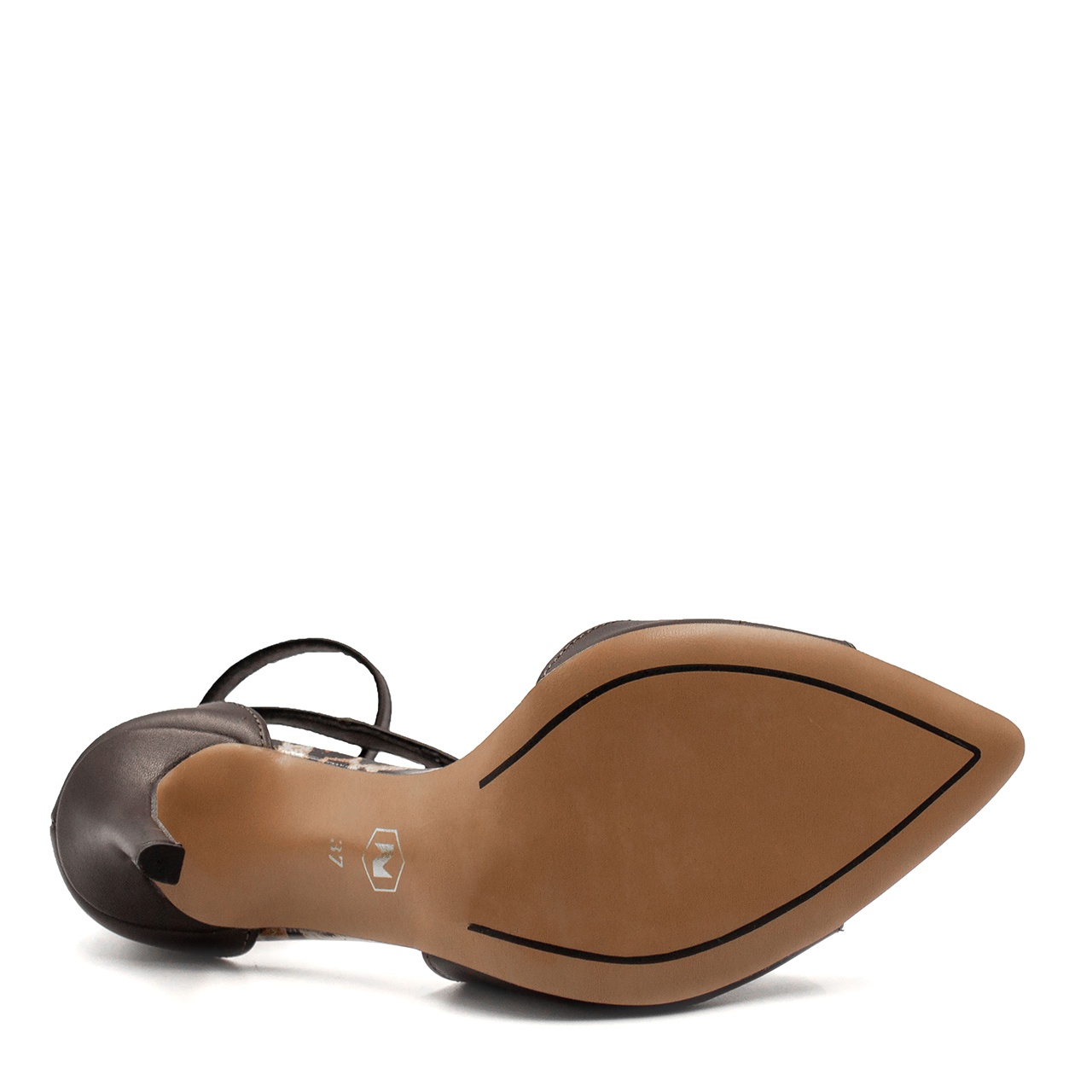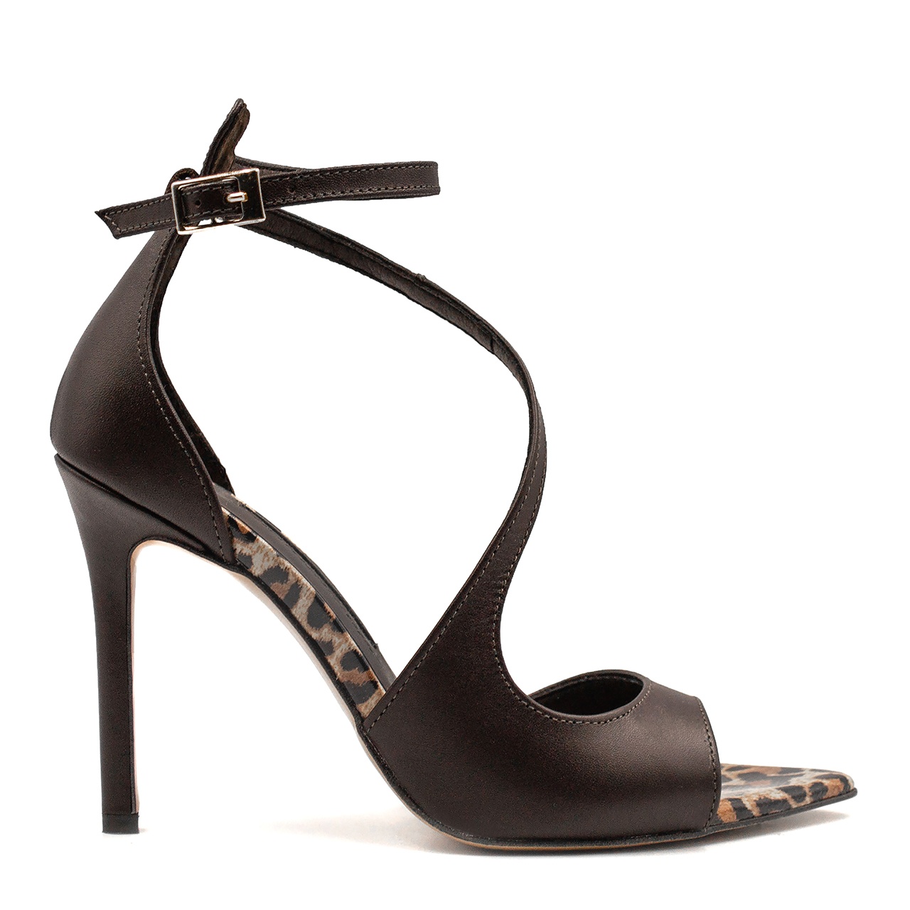 Czekoladowe skórzane szpilki z paskiem i panterą 121H