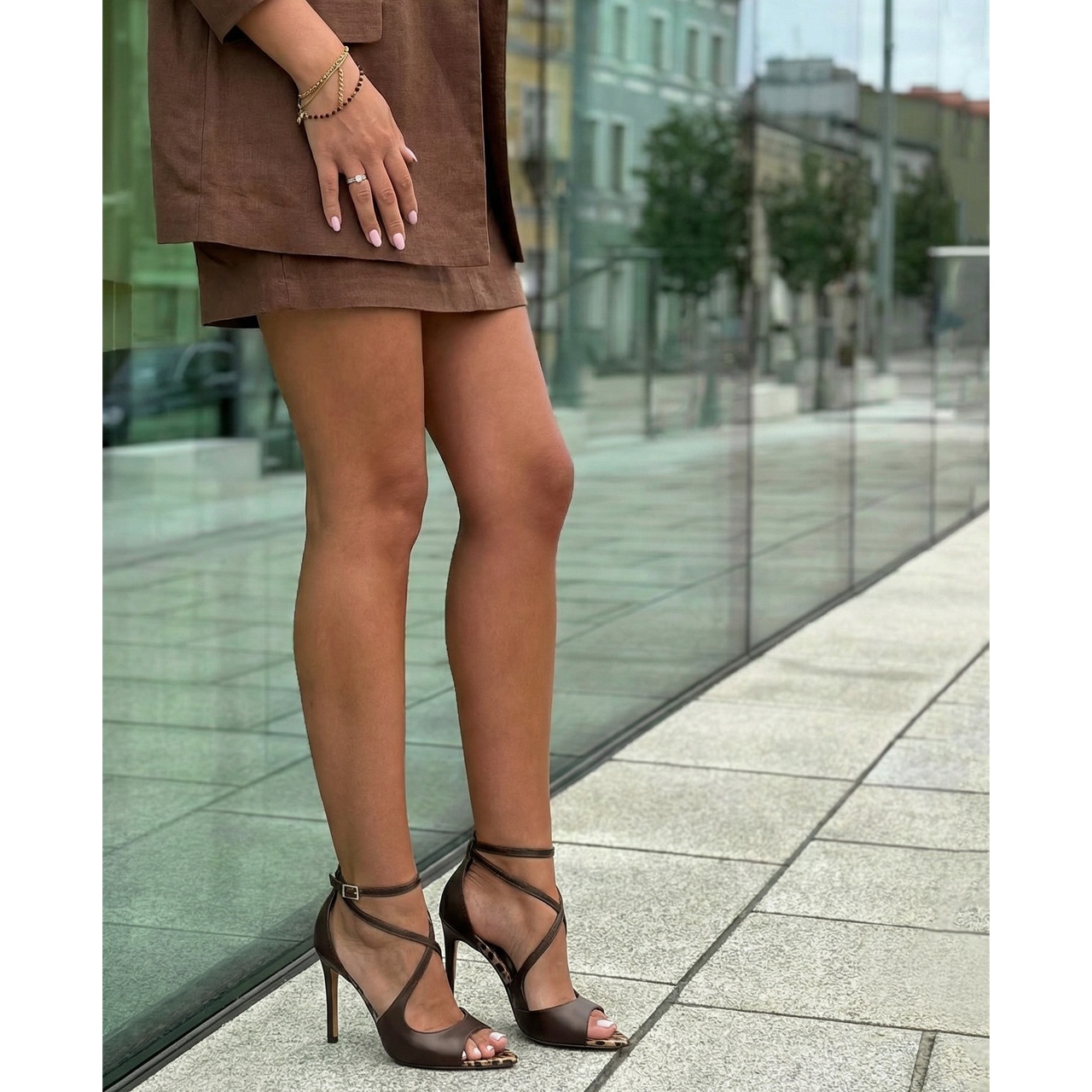 Czekoladowe szpilki z panterą i noskiem w szpic wykonano ze skóry naturalnej licowej. Niespotykane zapięcie i pasek na bok to atrakcyjny dodatek w tym modelu. Obcas w szpilkach wynosi 10 cm. Wkładki w butach są skórzane. Wymiary podawane na kartach produktów to wymiary orientacyjne i odnoszą się do rozmiaru 37.