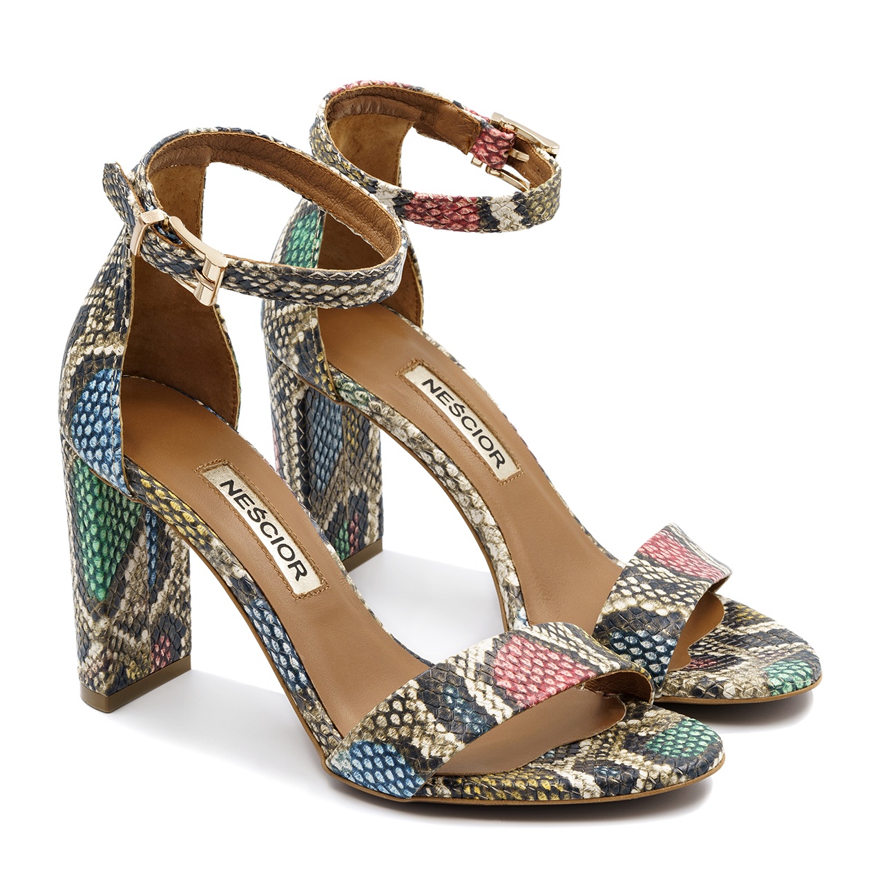Wężowe z dodatkiem różnych kolorów sandały z zapięciem na kostce wykonane są z naturalnej skóry imitującej skórę węża. Z uwagi na fakturę skóry sprzedawany produkt może różnić się w nieznacznym stopniu od modelu przedstawionego na zdjęciach. Obcas w sandałach wynosi 9 cm. Nosek butów w migdał. Wkładki w butach są skórzane. Wymiary podawane na kartach produktów to wymiary orientacyjne i odnoszą się do rozmiaru 37.