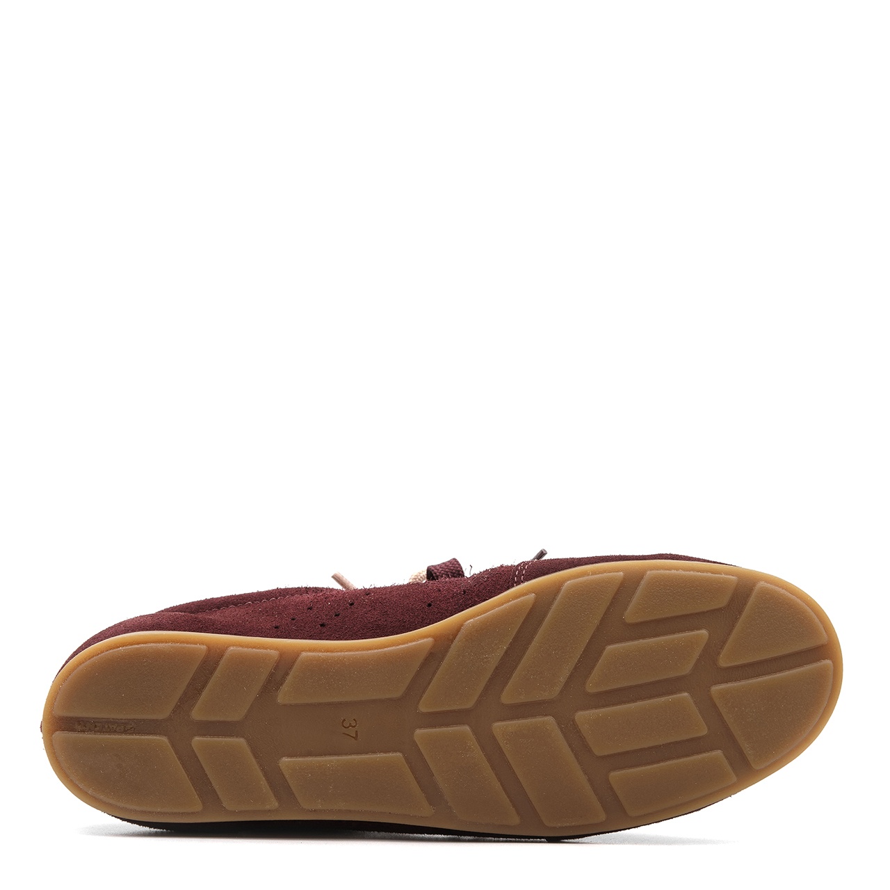 Bordowe welurowe sneakersy idealne do codziennych stylizacji. Obuwie wykonano ze skóry welurowej z połączeniem skóry licowej na pięcie. Obuwie łączy w sobie design przez dodatkowe różowe sznurowadła. Wysokość podeszwy z tyłu wynosi około 1 cm, a z przodu około 0,5 cm. Wysokość zapiętka od podeszwy wynosi około 9 cm. Wkładka w butach jest skórzana, a podszewka z materiału. Wymiary podawane na kartach produktów to wymiary orientacyjne i odnoszą się do rozmiaru 37.