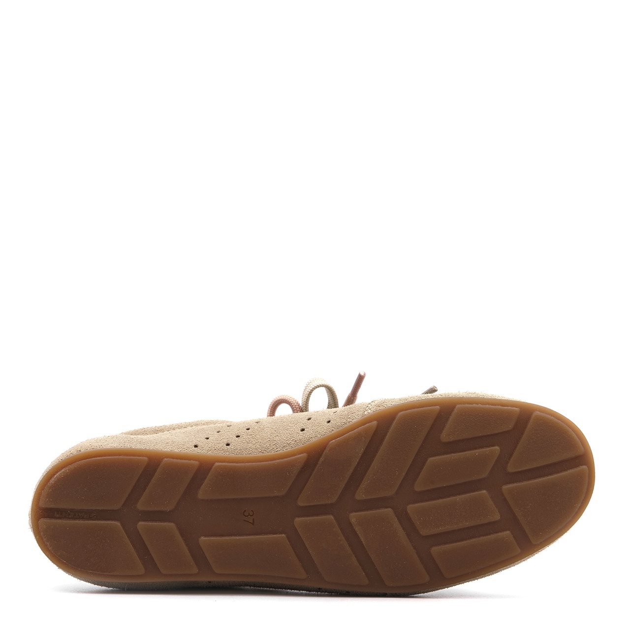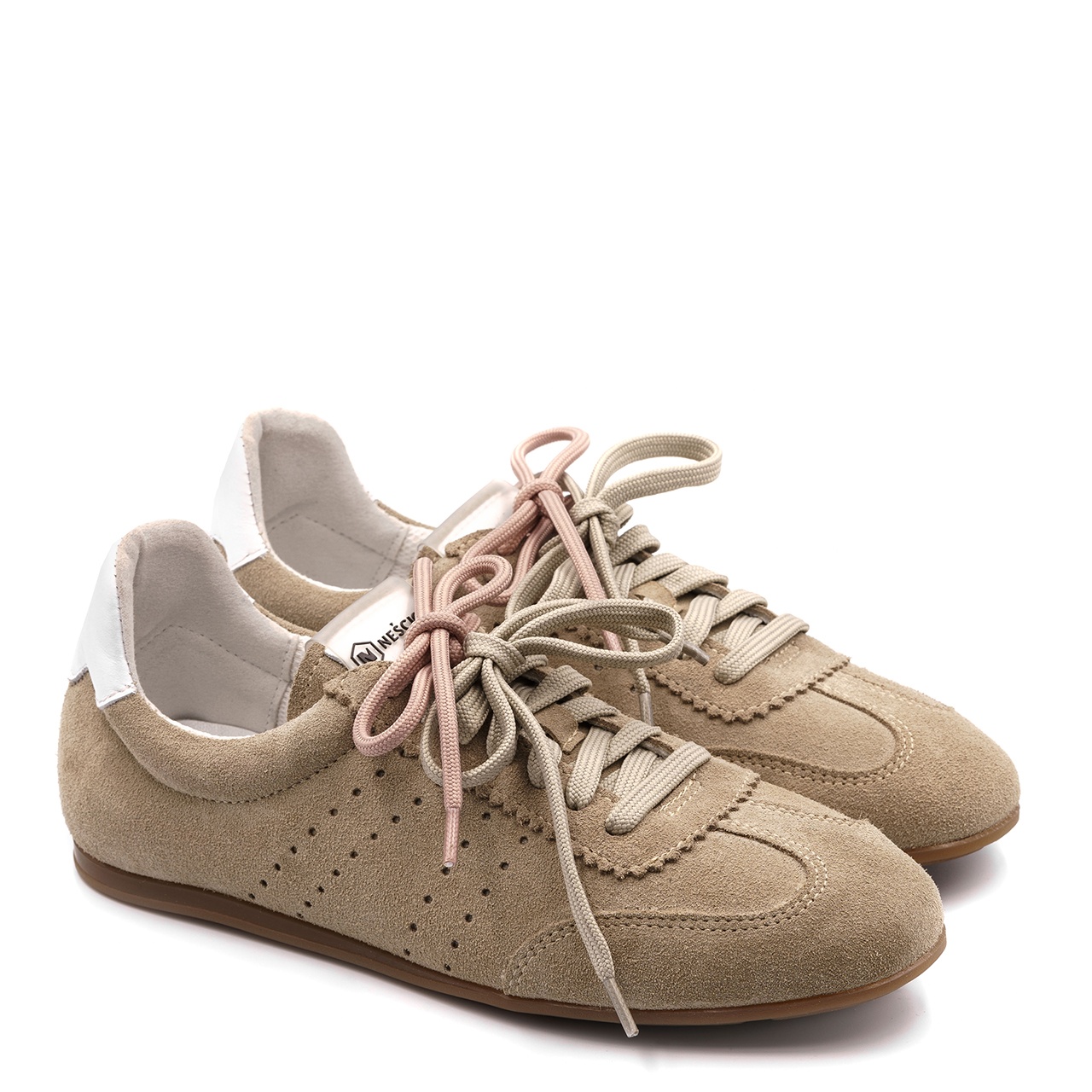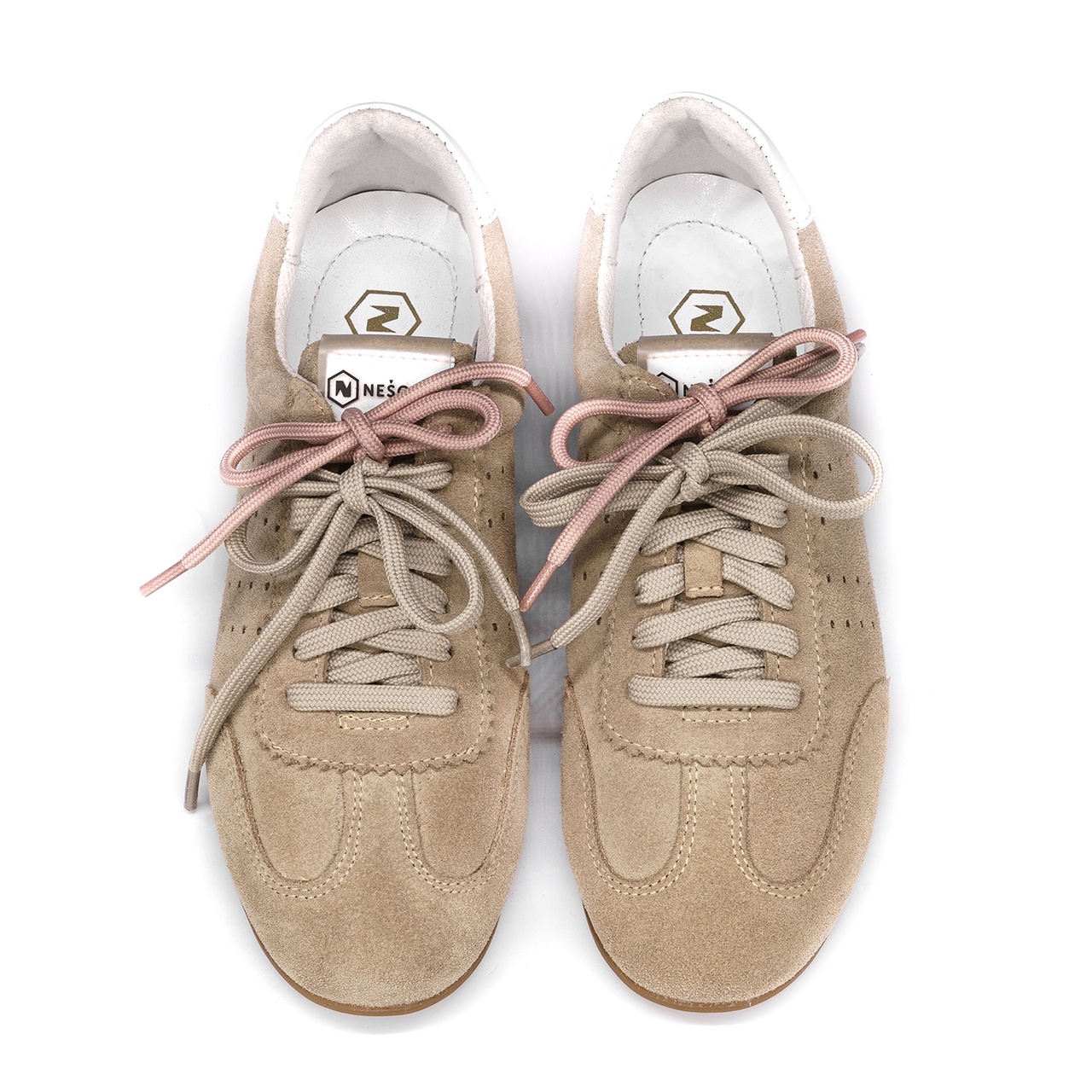 Beżowe welurowe sneakersy idealne do codziennych stylizacji. Obuwie wykonano ze skóry welurowej z połączeniem skóry licowej na pięcie. Obuwie łączy w sobie design przez dodatkowe różowe sznurowadła. Wysokość podeszwy z tyłu wynosi około 1 cm, a z przodu około 0,5 cm. Wysokość zapiętka od podeszwy wynosi około 9 cm. Wkładka w butach jest skórzana, a podszewka z materiału. Wymiary podawane na kartach produktów to wymiary orientacyjne i odnoszą się do rozmiaru 37.
