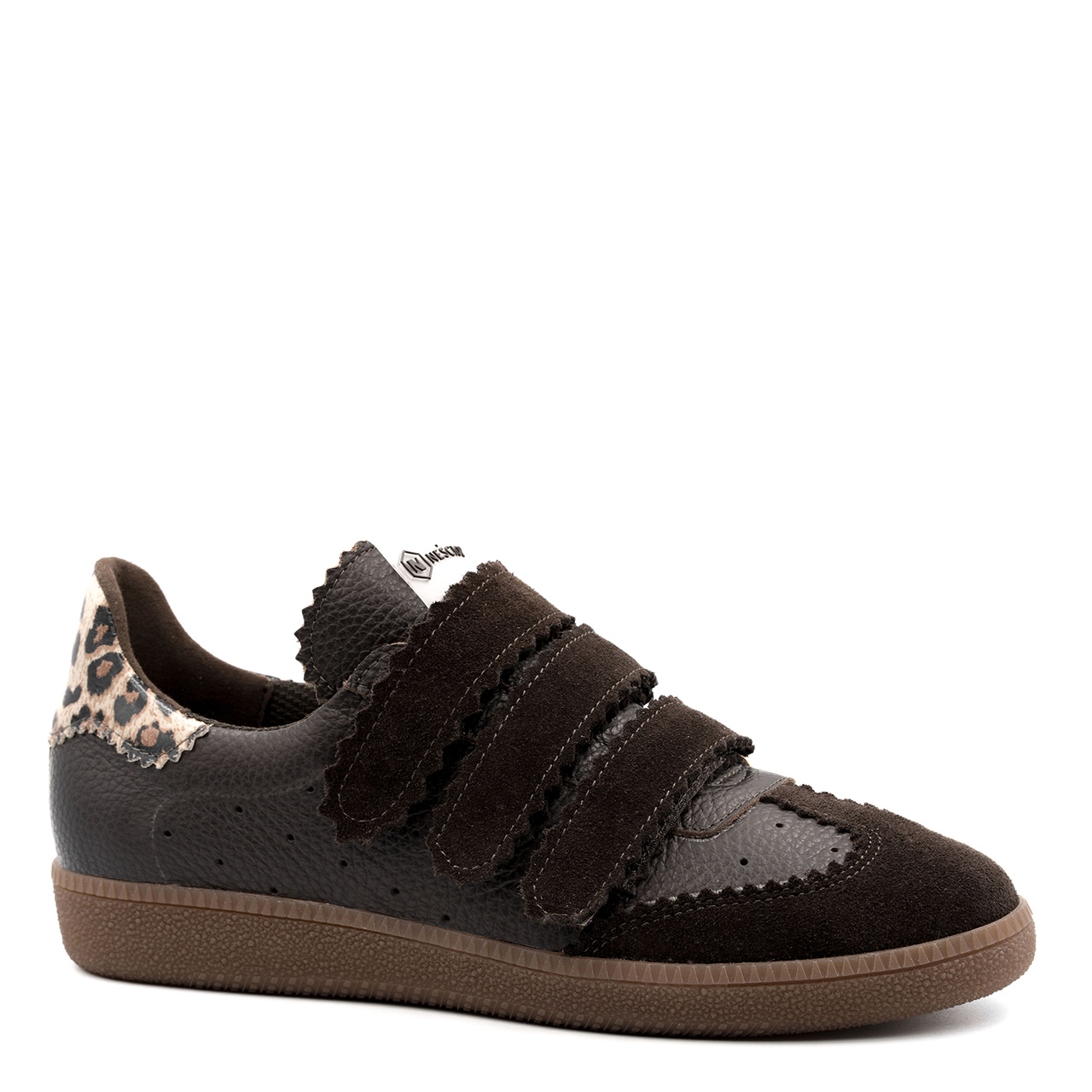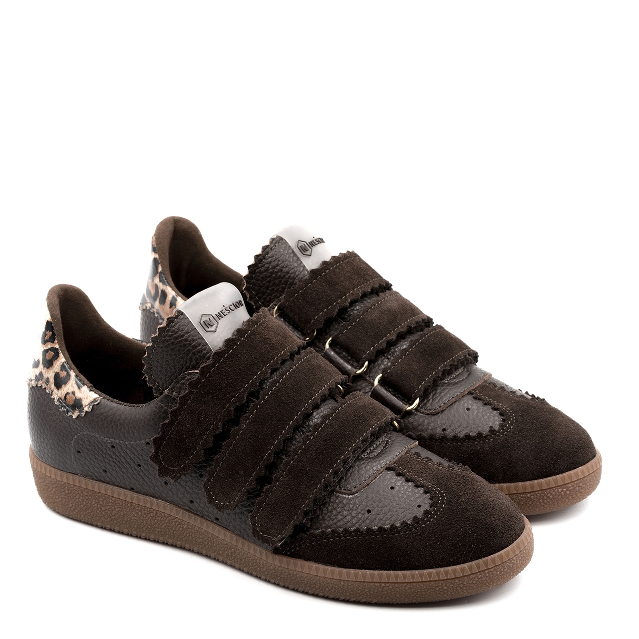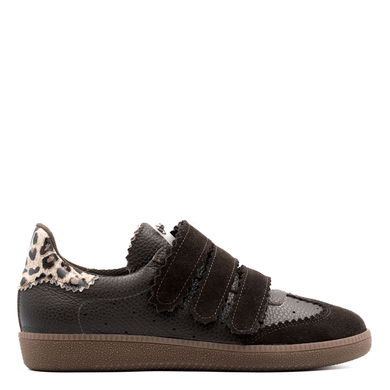 Brązowe sneakersy wykonane ze skóry licowej z widocznym uziarnieniem uzupełnione są detalami w panterkę. Obuwie łączy w sobie design i komfort noszenia. Buty wyróżniają się trzema rzepami wykonanych ze skóry zamszowej. Doskonale połączysz je do każdego stylu. Wysokość podeszwy wynosi około 2,5 cm. Wkładka w butach jest skórzana, a podszewka z materiału. Wymiary podawane na kartach produktów to wymiary orientacyjne i odnoszą się do rozmiaru 37.
