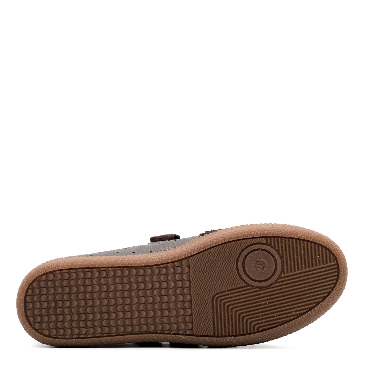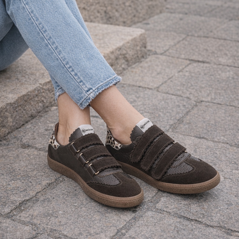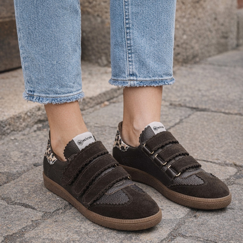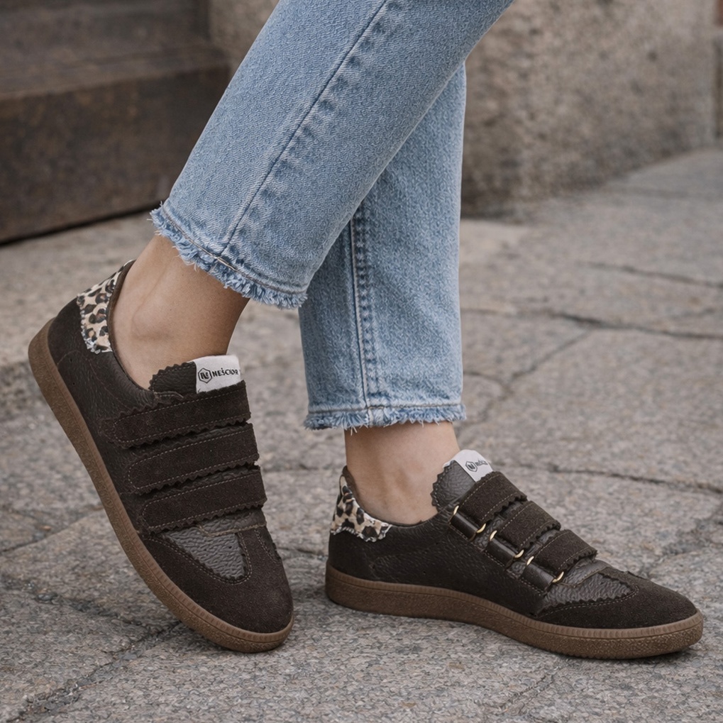 Brązowe sneakersy wykonane ze skóry licowej z widocznym uziarnieniem uzupełnione są detalami w panterkę. Obuwie łączy w sobie design i komfort noszenia. Buty wyróżniają się trzema rzepami wykonanych ze skóry zamszowej. Doskonale połączysz je do każdego stylu. Wysokość podeszwy wynosi około 2,5 cm. Wkładka w butach jest skórzana, a podszewka z materiału. Wymiary podawane na kartach produktów to wymiary orientacyjne i odnoszą się do rozmiaru 37.