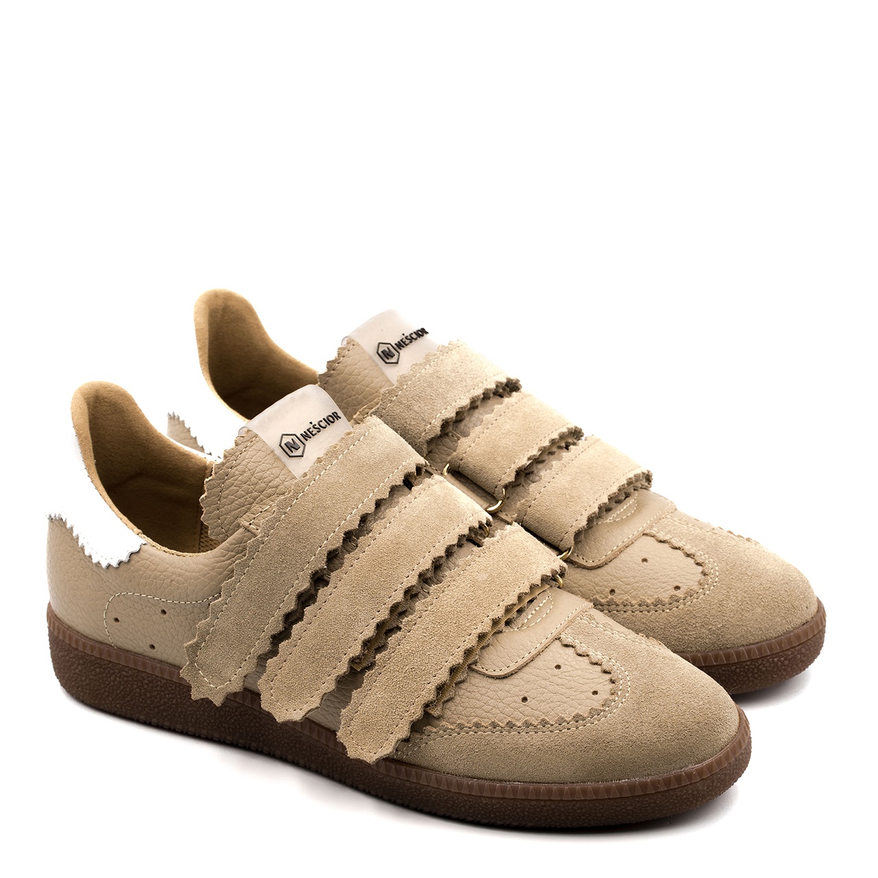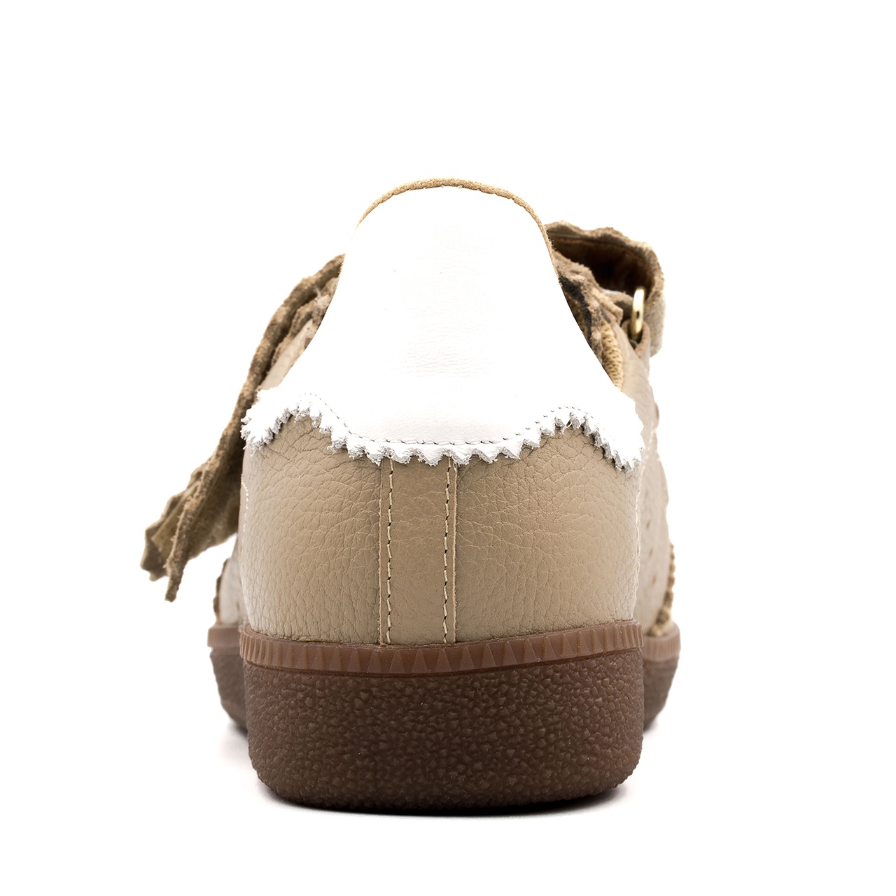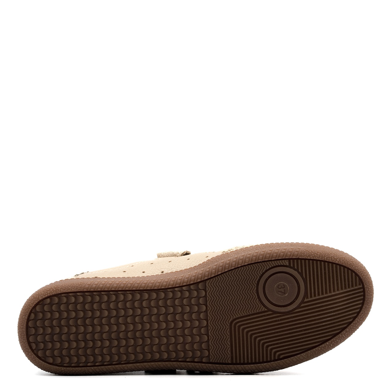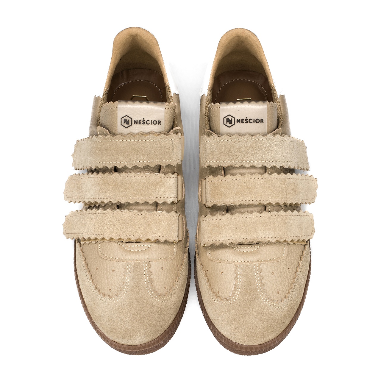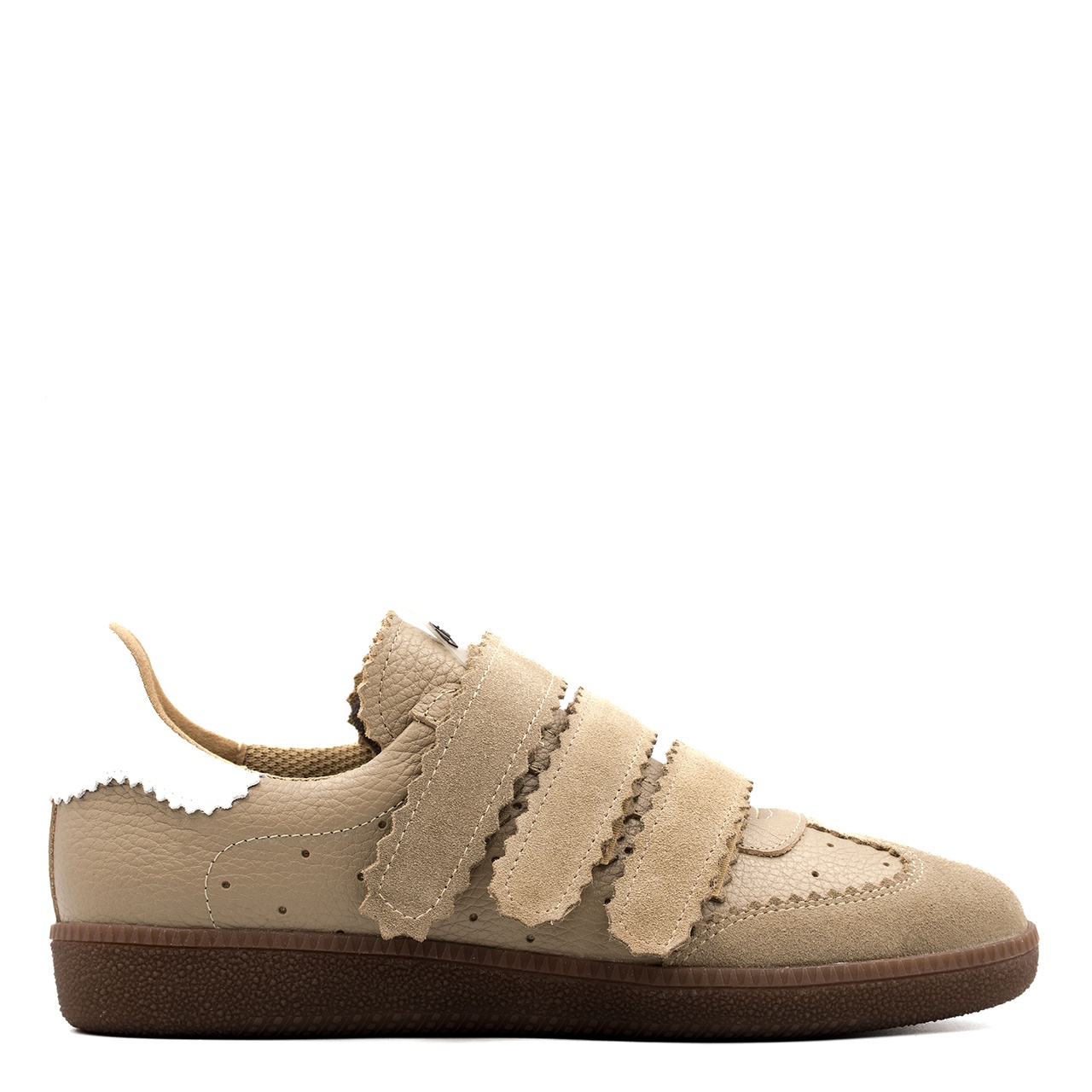 Beżowo-białe sneakersy wykonane ze skóry licowej z widocznym. Obuwie łączy w sobie design i komfort noszenia. Buty wyróżniają się trzema rzepami wykonanych ze skóry zamszowej. Doskonale połączysz je do każdego stylu. Wysokość podeszwy wynosi około 2,5 cm. Wkładka w butach jest skórzana, a podszewka z materiału. Wymiary podawane na kartach produktów to wymiary orientacyjne i odnoszą się do rozmiaru 37.