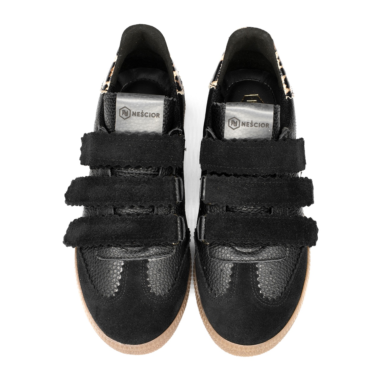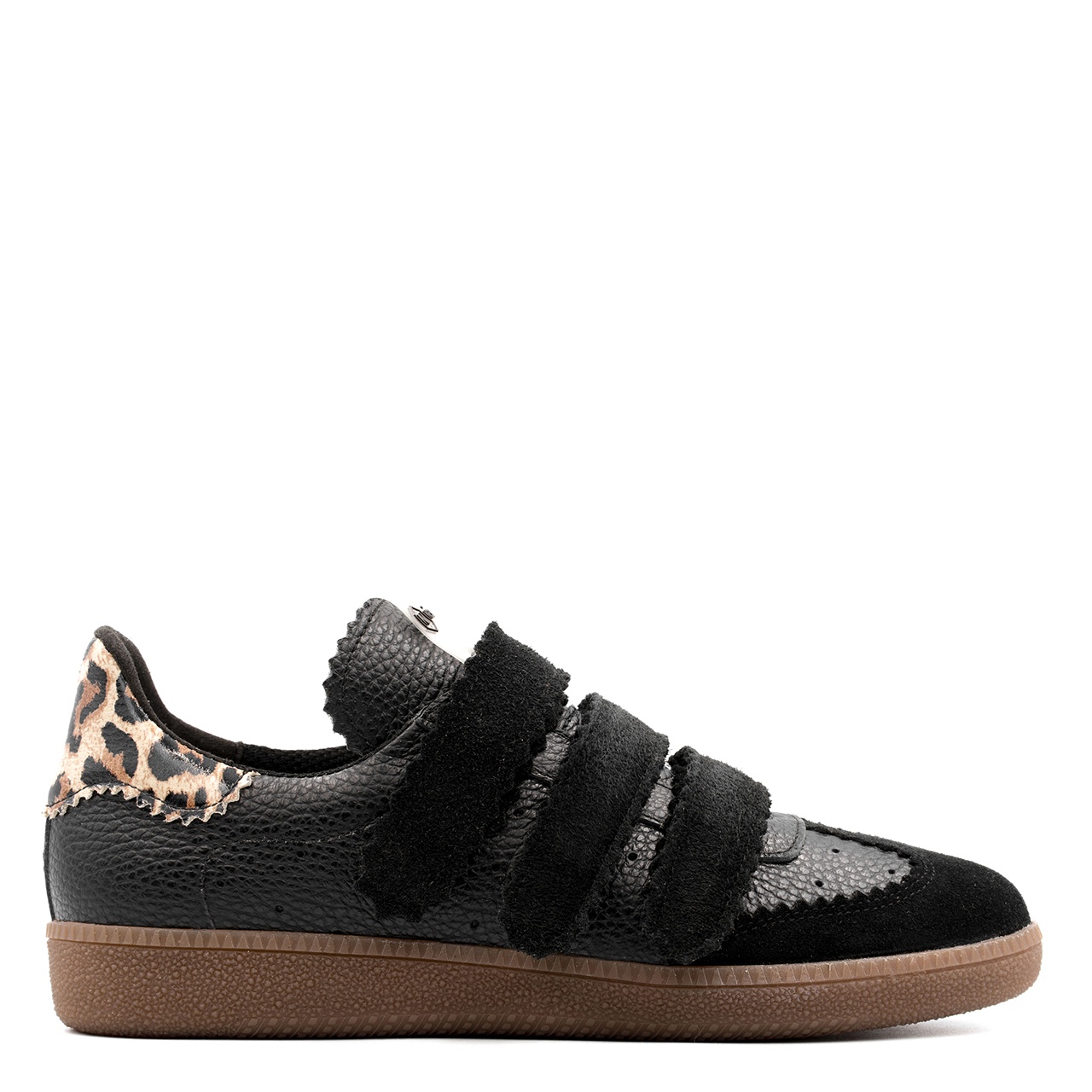 Czarne sneakersy wykonane ze skóry licowej z widocznym uziarnieniem uzupełnione są detalami w panterkę. Obuwie łączy w sobie design i komfort noszenia. Buty wyróżniają się trzema rzepami wykonanych ze skóry zamszowej. Doskonale połączysz je do każdego stylu. Wysokość podeszwy wynosi około 2,5 cm. Wkładka w butach jest skórzana, a podszewka z materiału. Wymiary podawane na kartach produktów to wymiary orientacyjne i odnoszą się do rozmiaru 37.