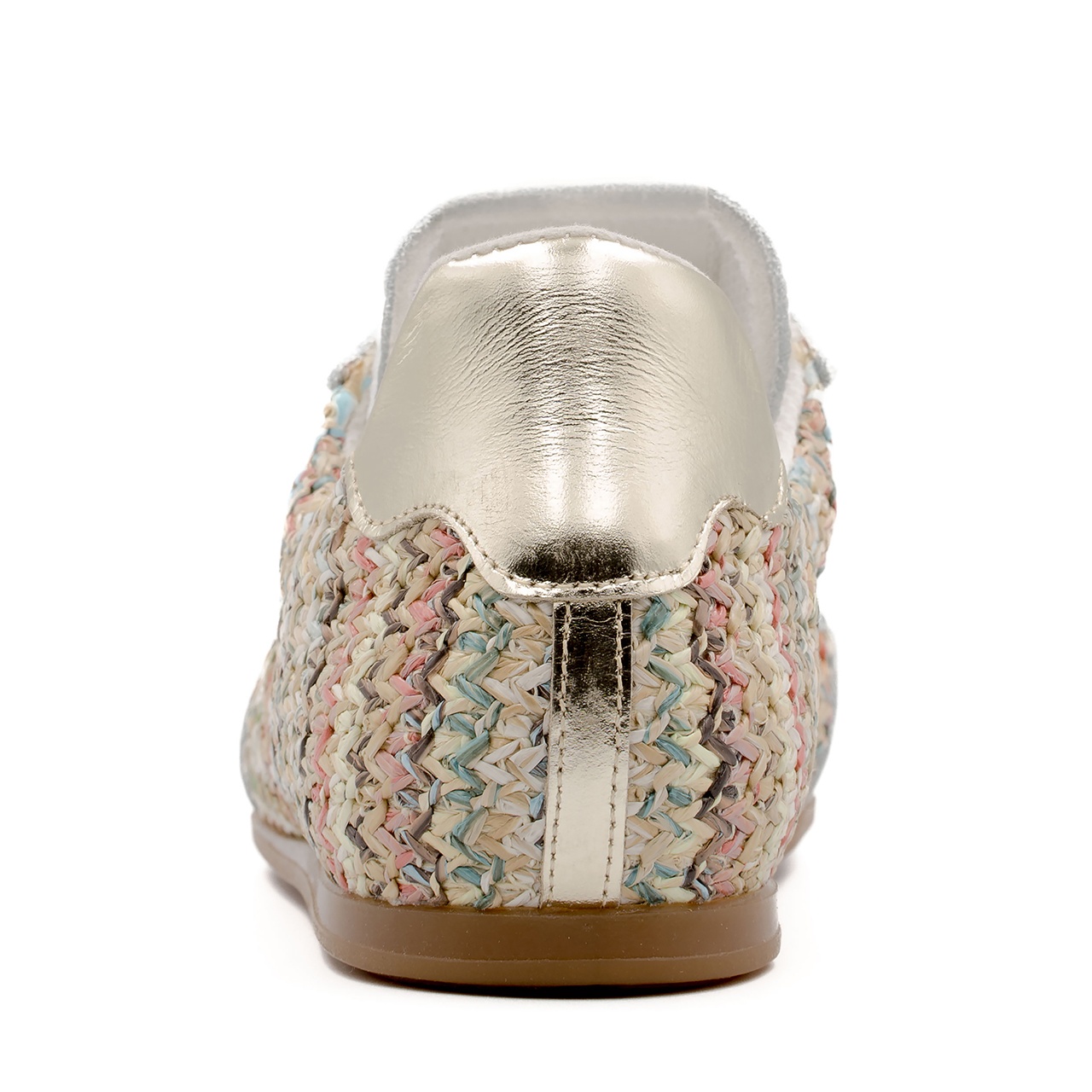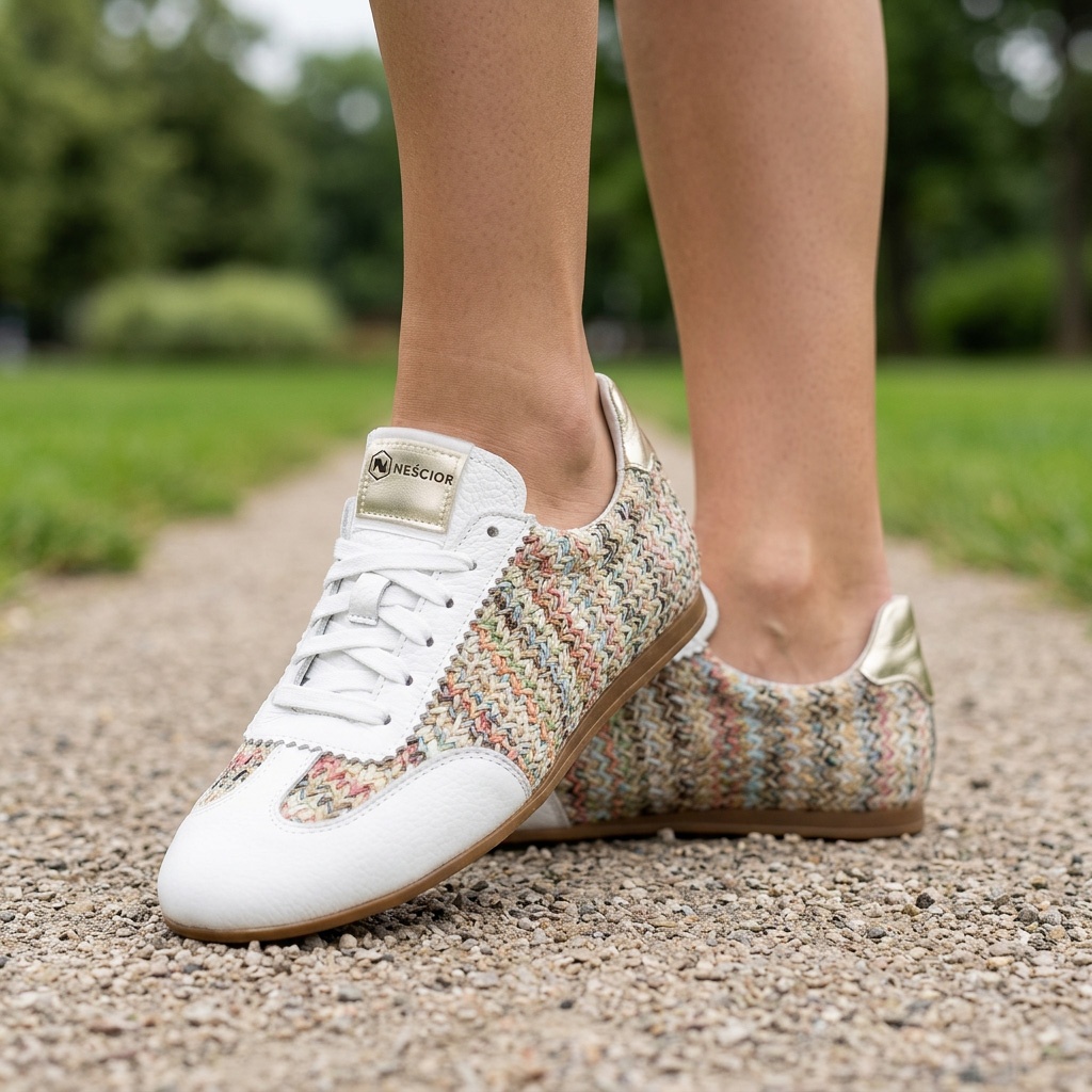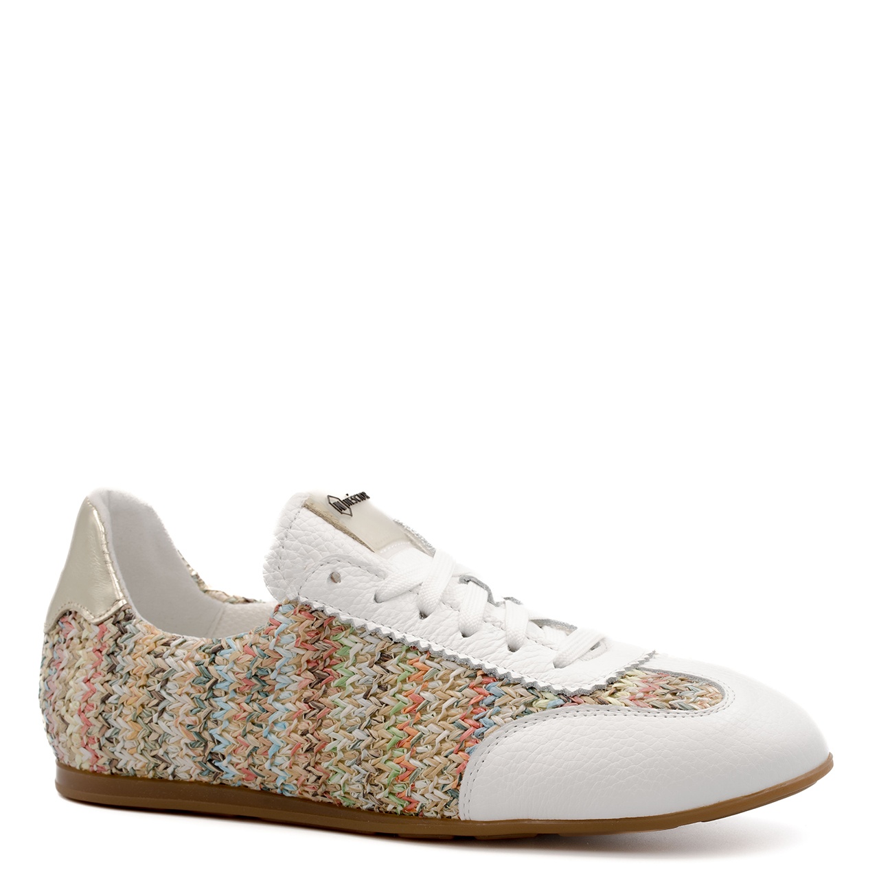 Białe, kolorowe sneakersy idealne do codziennych stylizacji. Obuwie wykonano ze skóry licowej z widocznym uziarnieniem z dodatkiem materiału z plecionki. Obuwie łączy w sobie design. Wysokość podeszwy z tyłu wynosi około 1 cm, a z przodu około 0,5 cm. Wkładka w butach jest skórzana, a podszewka z materiału. Wymiary podawane na kartach produktów to wymiary orientacyjne i odnoszą się do rozmiaru 37.