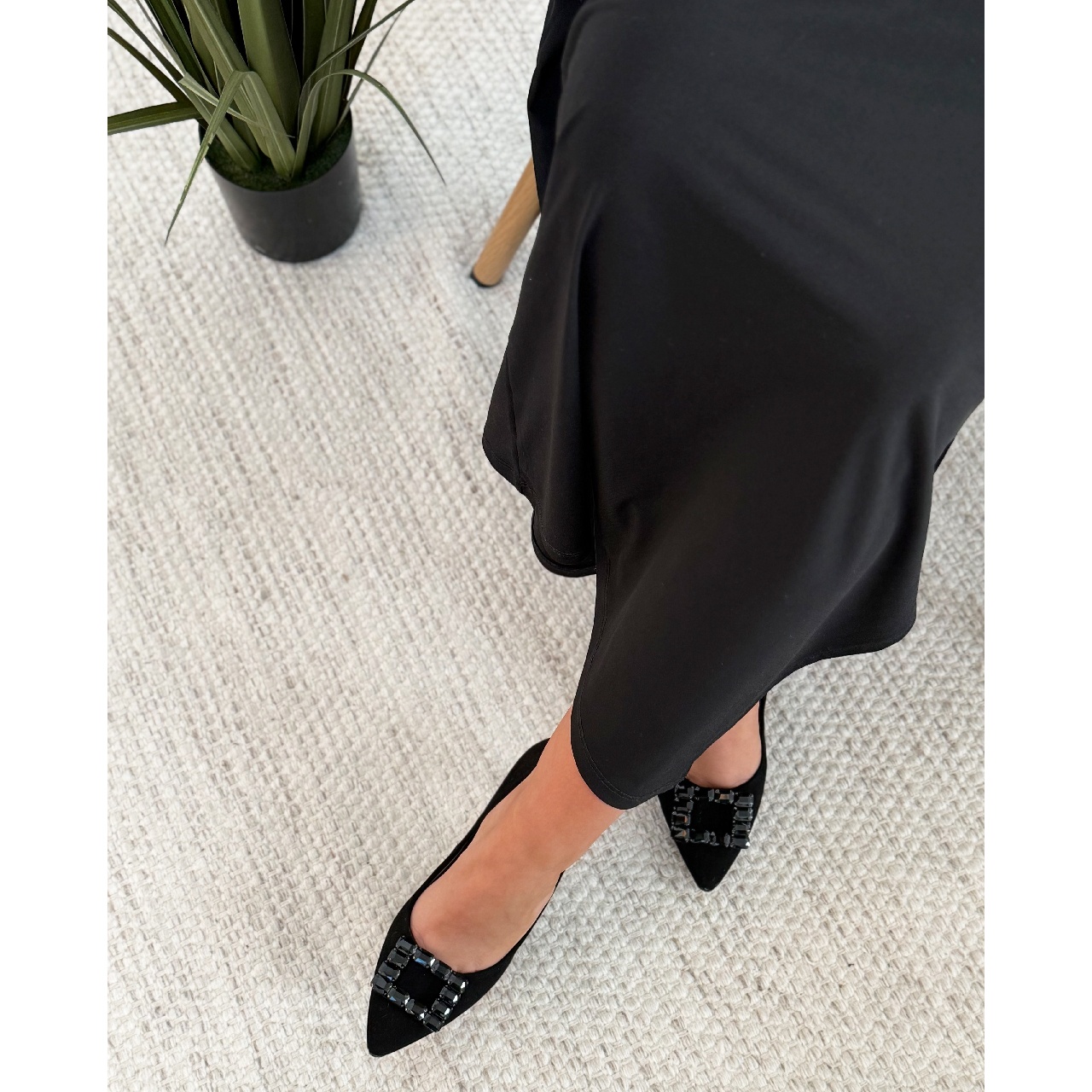 Czarne delikatne, eleganckie szpilki na 9 cm obcasie. Obuwie wykonano z naturalnej skóry zamszowej. Noski butów w szpic ozdobiono prostokątną ozdobą z kryształkami, które się błyszczą i są w kolorze buta. Wkładka w butach jest skórzana. Wymiary podawane na kartach produktów to wymiary orientacyjne i odnoszą się do rozmiaru 37.