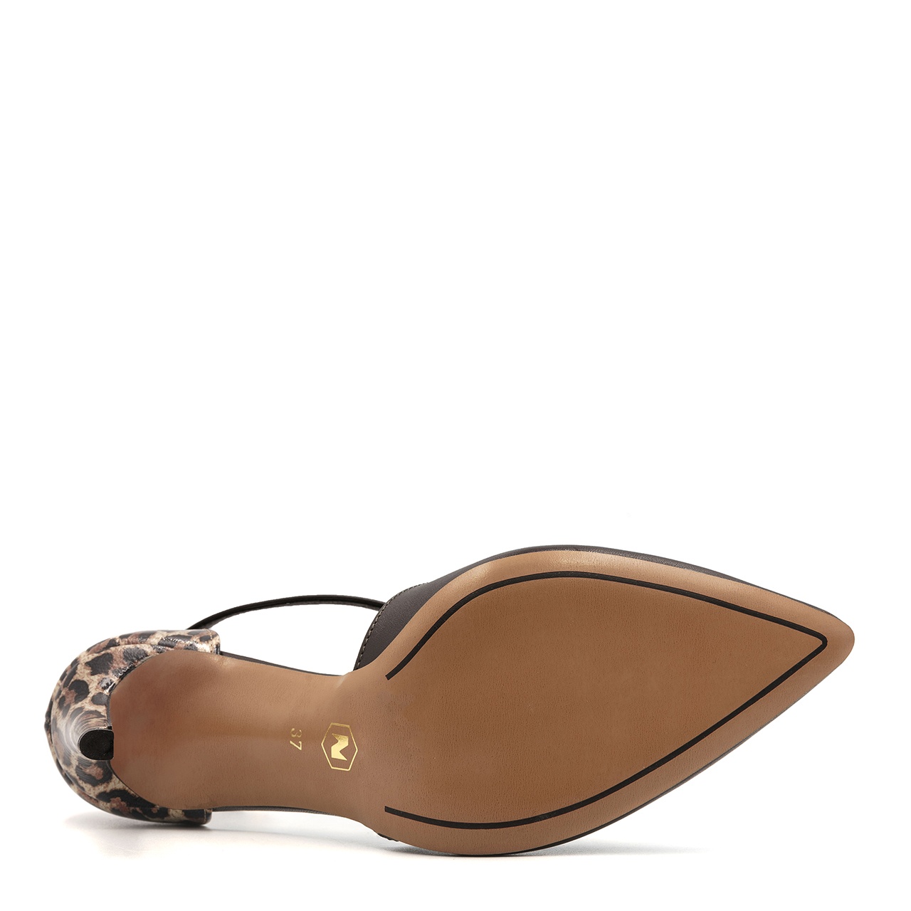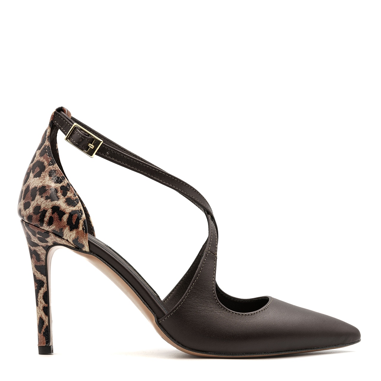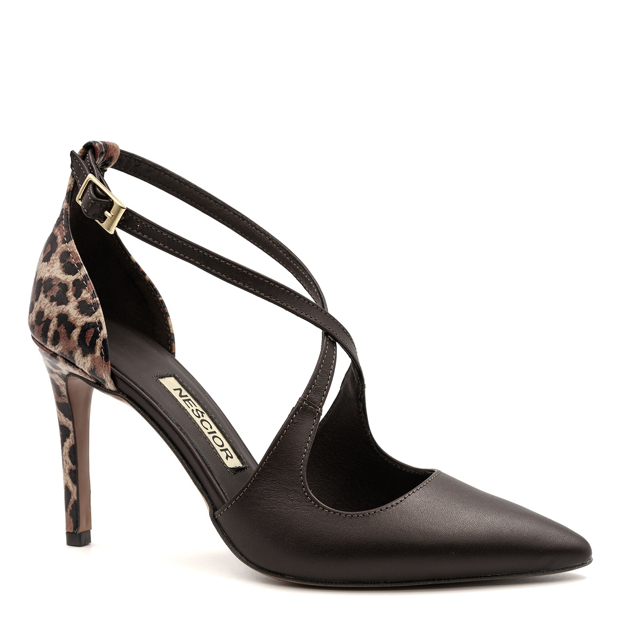 Czekoladowe skórzane szpilki na 9 cm obcasie. Buty wykonane są ze skóry naturalnej licowej. Na pięcie zostały obszyte panterkową skórą, która pasuje do całości obuwia. Noski butów w szpic. Wkładki w butach są skórzane. Wymiary podawane na kartach produktów to wymiary orientacyjne i odnoszą się do rozmiaru 37.