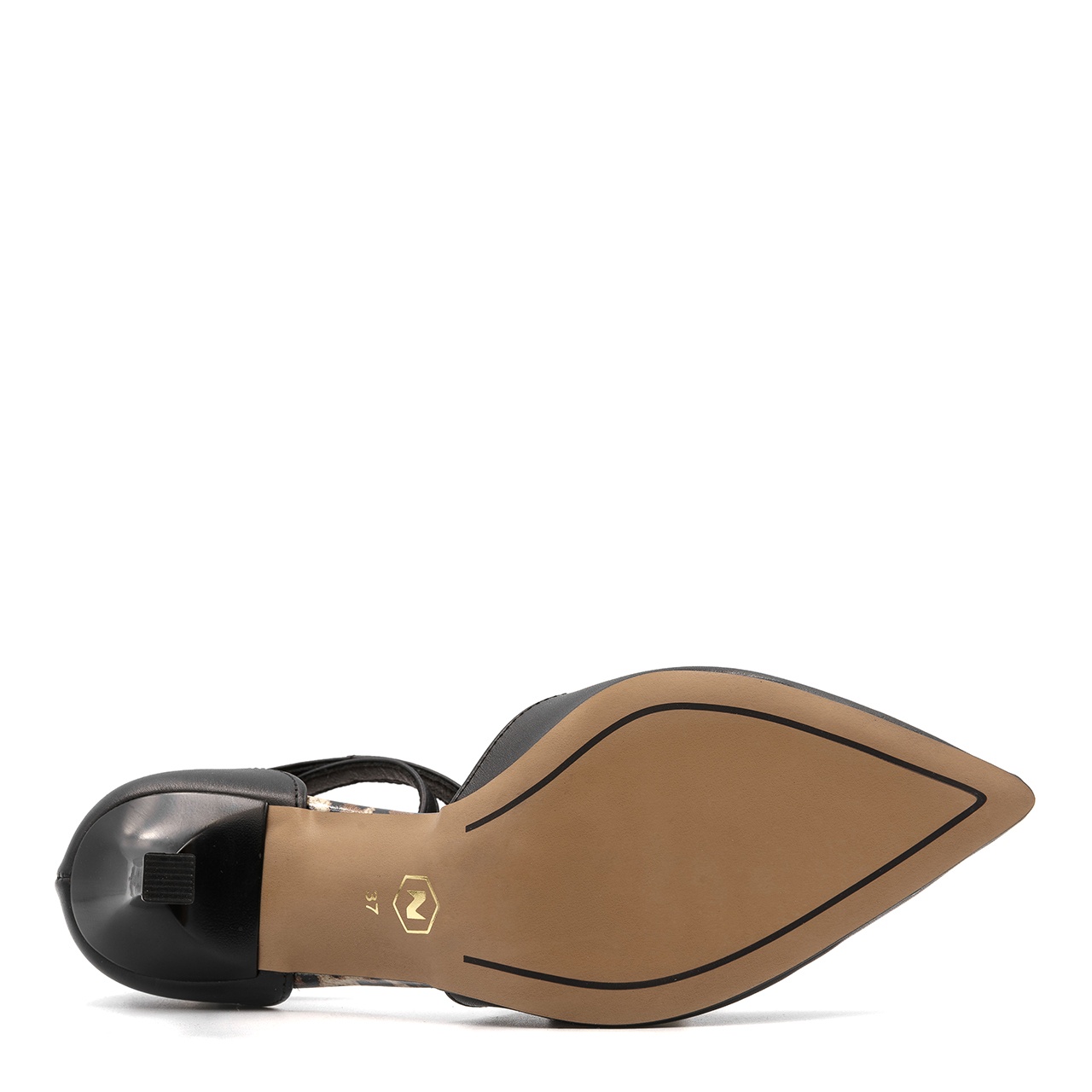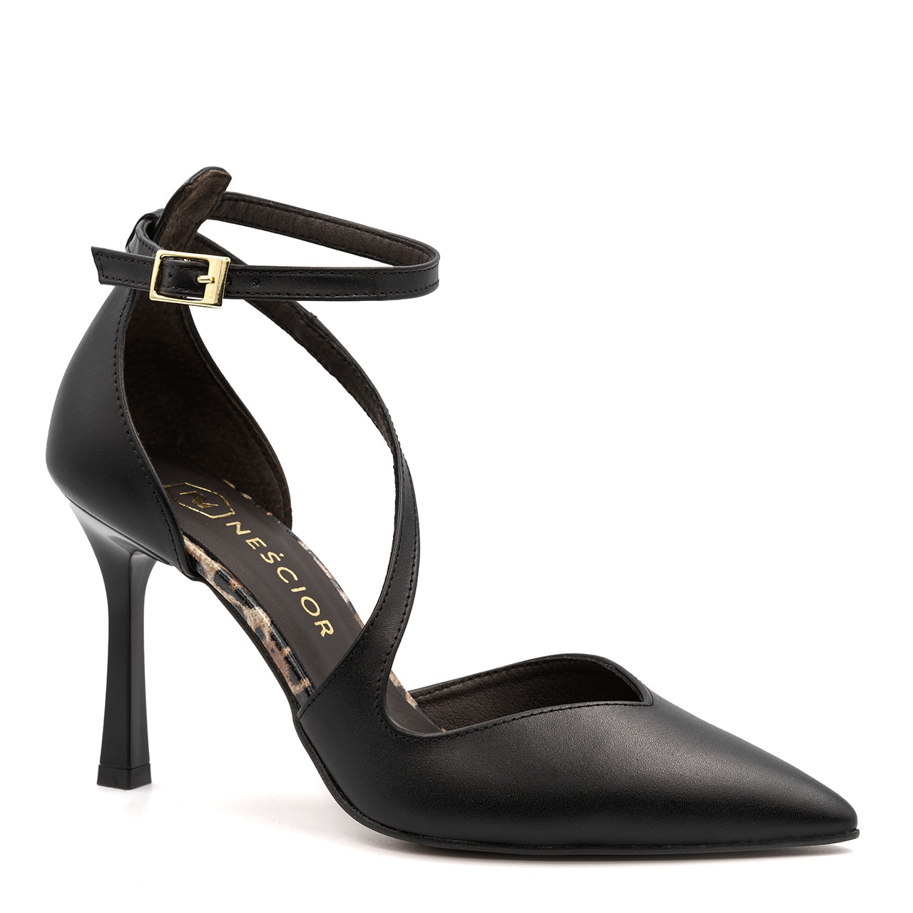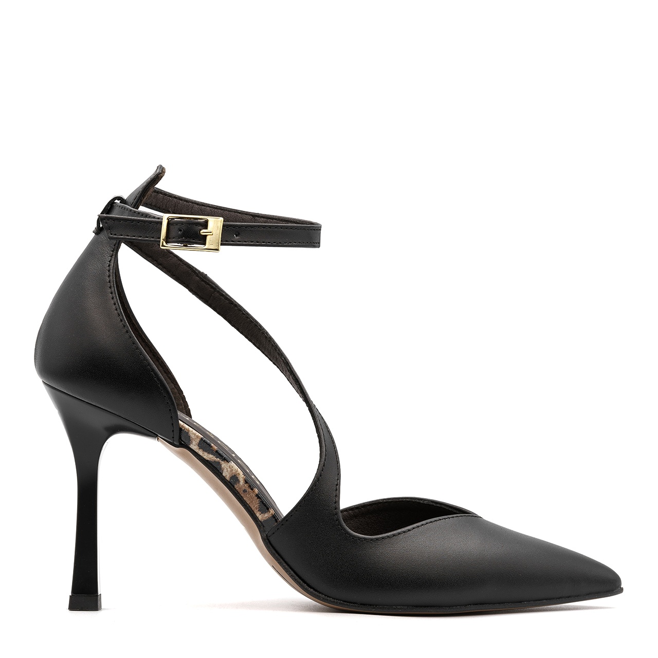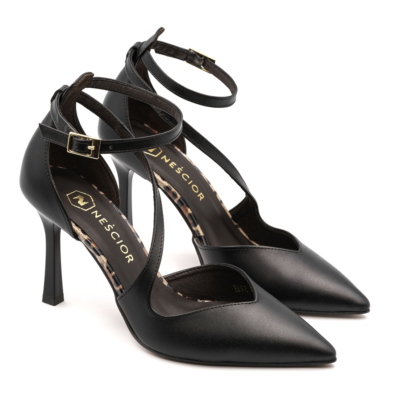 Czarne skórzane szpilki z panterą i paskami 231H