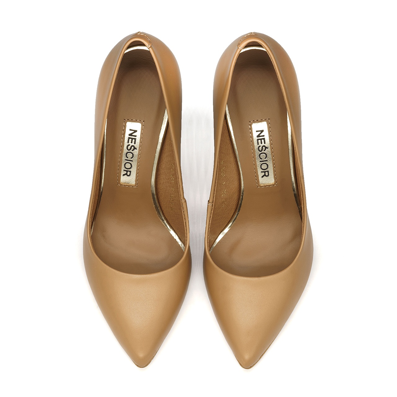 Karmelowe skórzane szpilki na 11 cm obcasie. Obuwie wykonane jest z naturalnej skóry licowej. Nosek szpilek w szpic. Wkładka w butach jest skórzana. Wymiary podawane na kartach produktów to wymiary orientacyjne i odnoszą się do rozmiaru 37.
