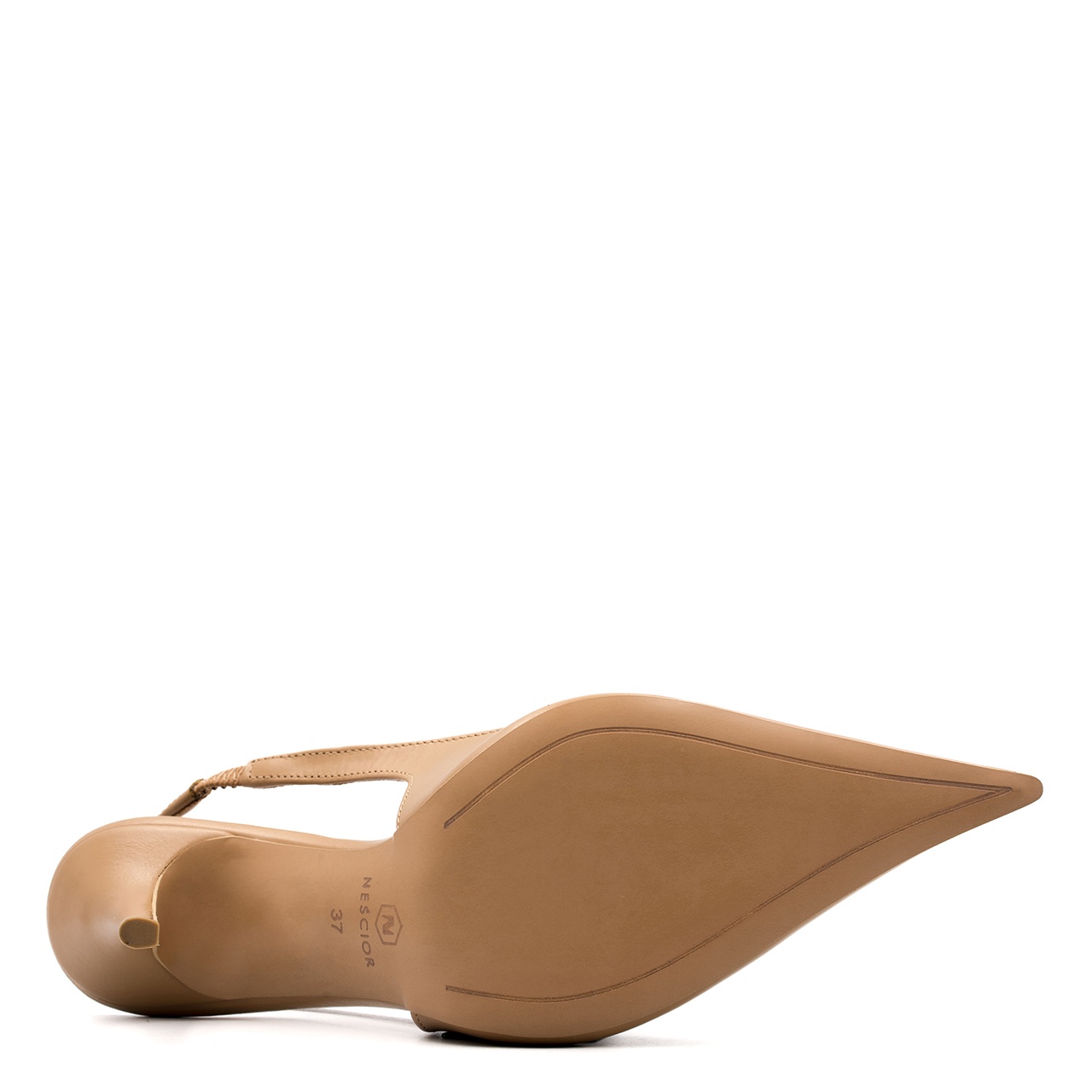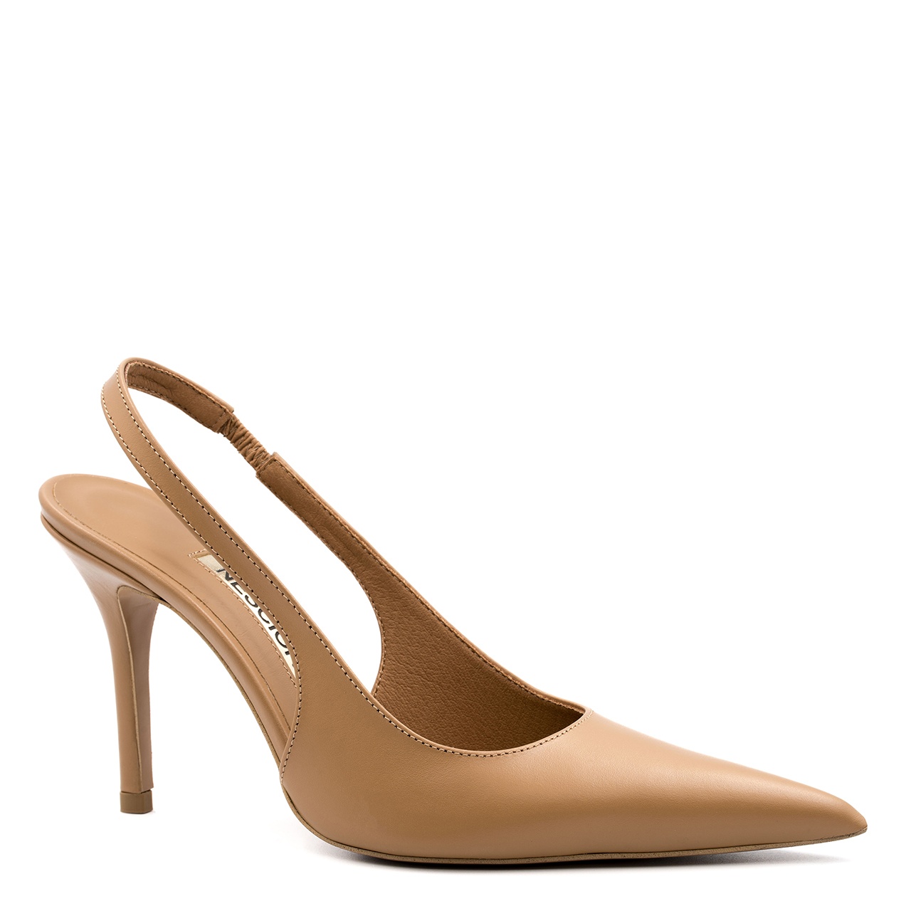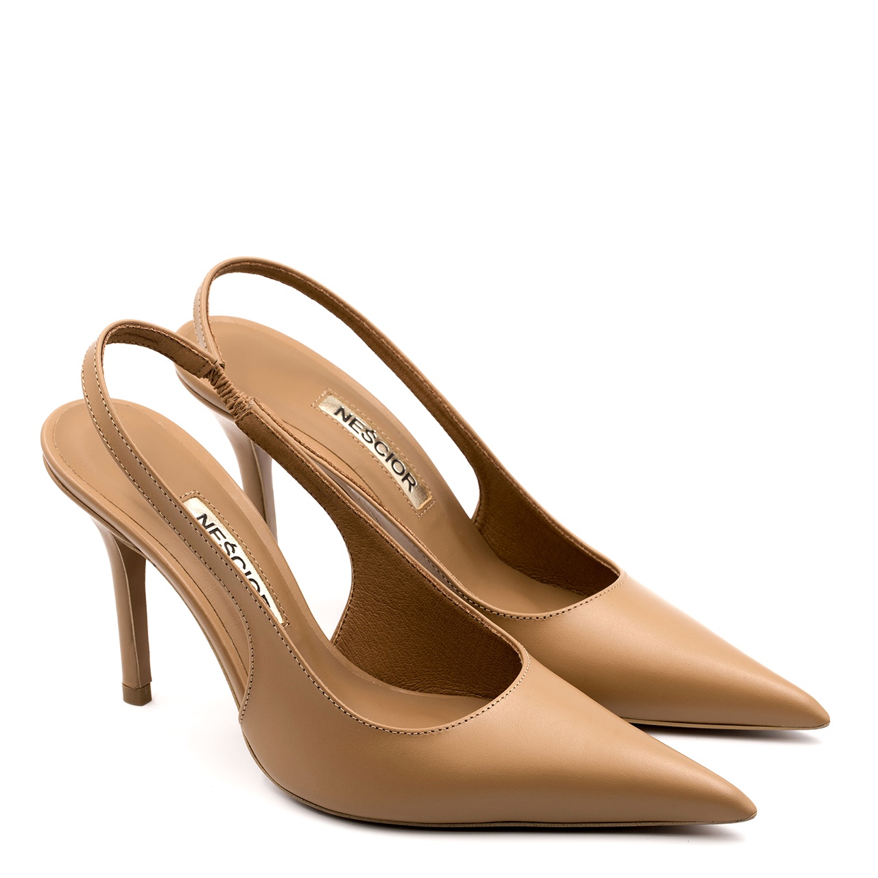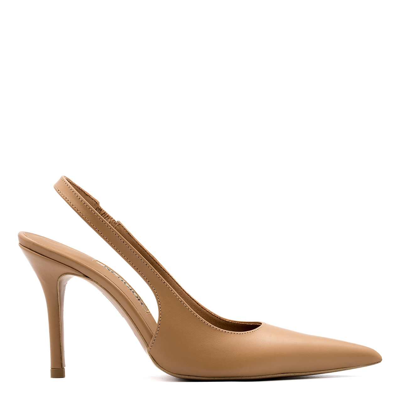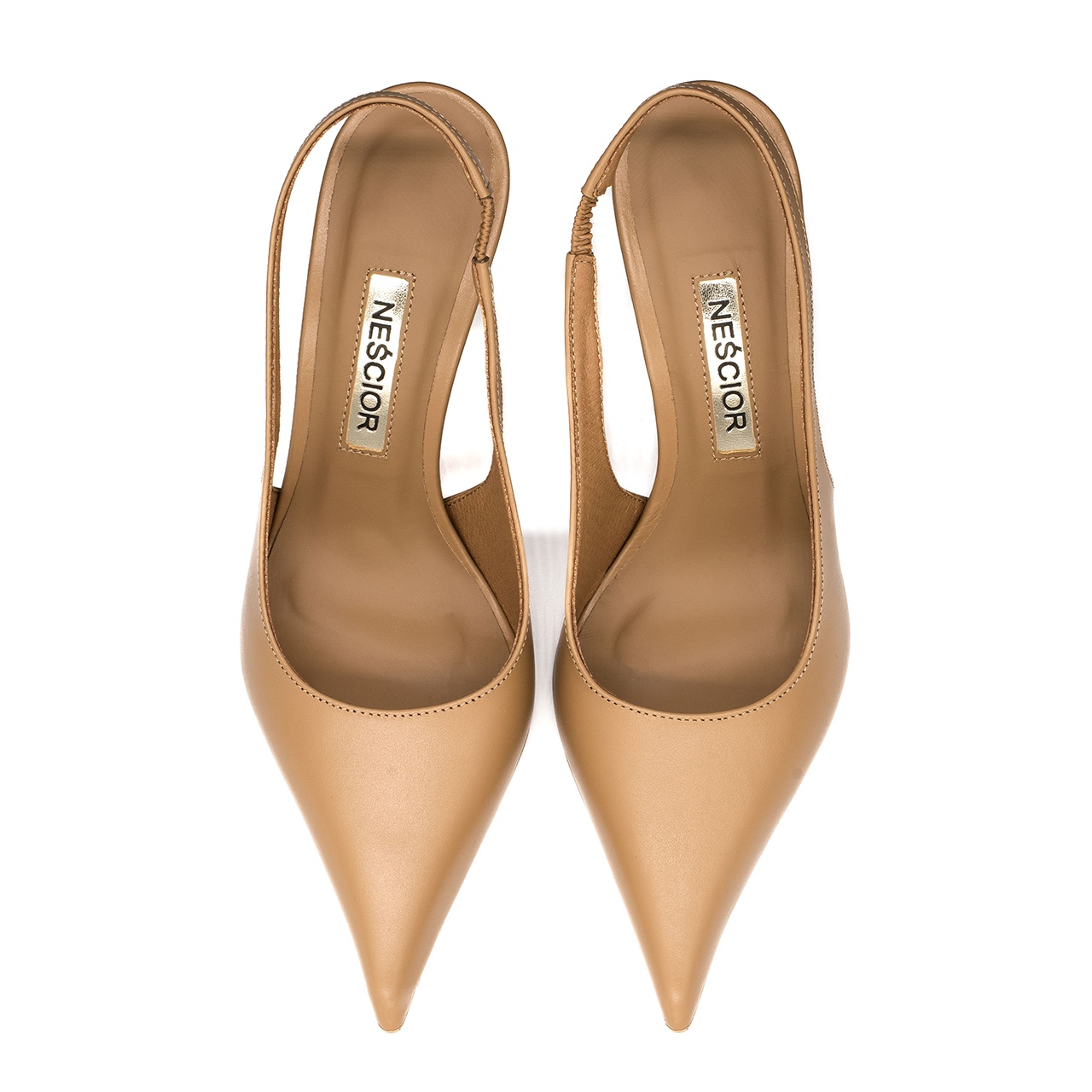 Karmelowe szpilki z długim noskiem to synonim klasy i elegancji. Obuwie wykonano ze skóry licowej. Obcas o wysokości około 9,5 cm pięknie podkreśla sylwetkę. Model pozbawiony jest zabudowanej pięty – zamiast niej zastosowano elastyczną gumkę, która stabilnie utrzymuje stopę. Wkładka w butach jest skórzana. Tęgość obuwia standardowa. Wymiary podawane na kartach produktów to wymiary orientacyjne i odnoszą się do rozmiaru 37.