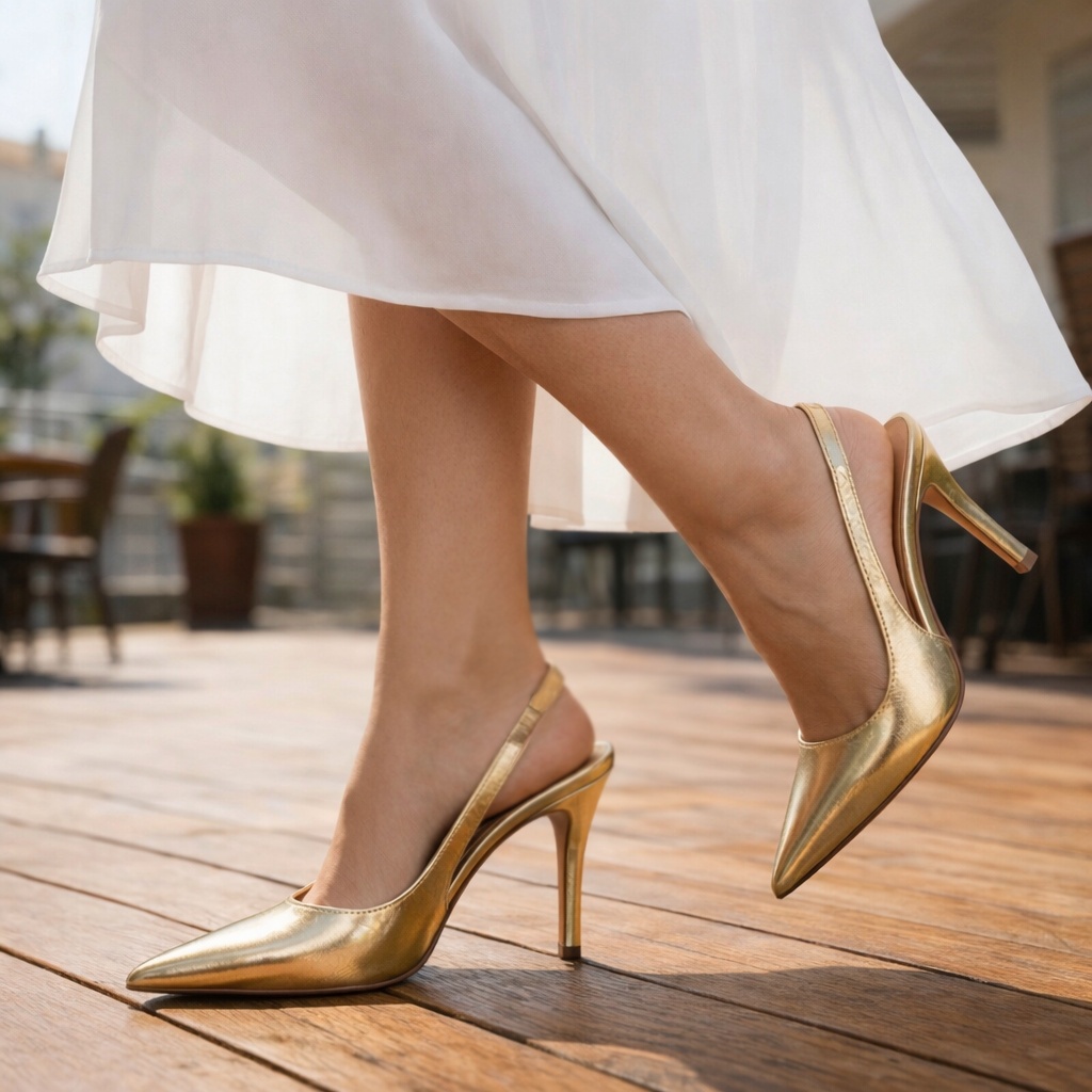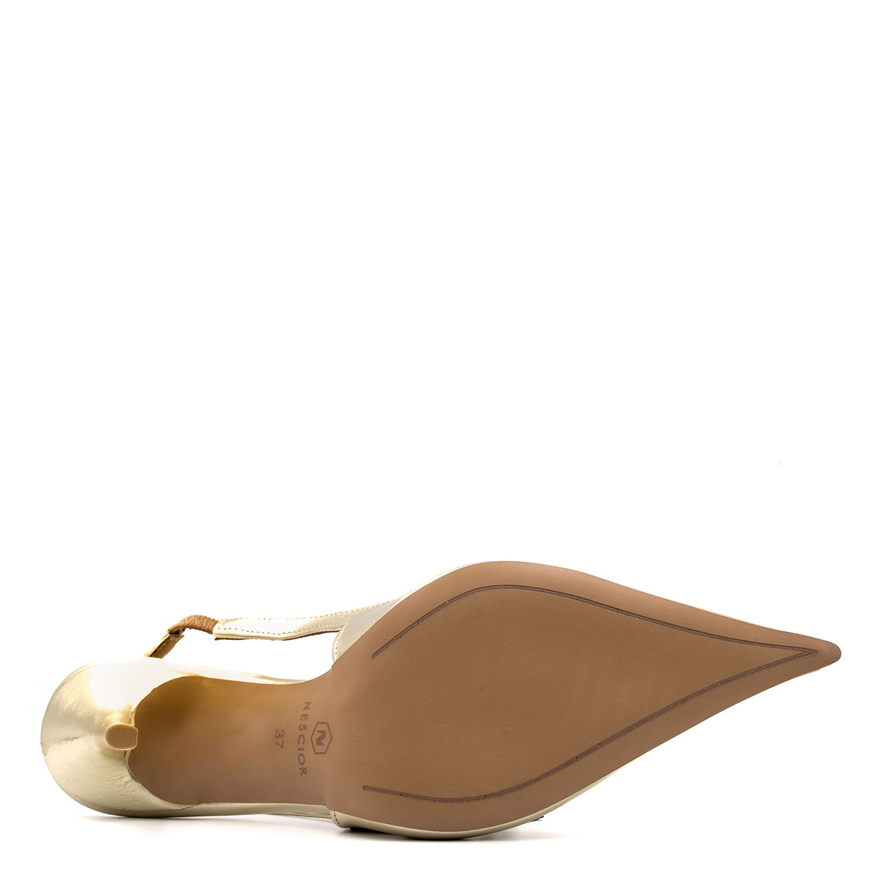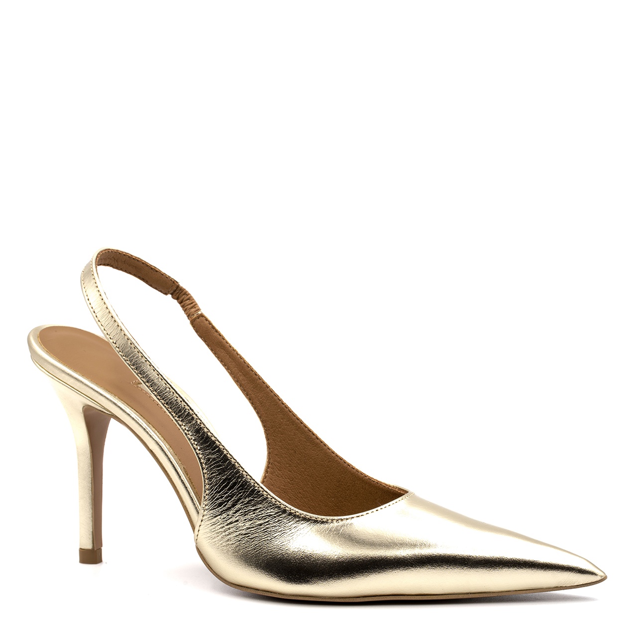 Złote szpilki z długim noskiem to synonim klasy i elegancji. Obuwie wykonano ze skóry naturalnej. Obcas o wysokości około 9,5 cm pięknie podkreśla sylwetkę. Model pozbawiony jest zabudowanej pięty – zamiast niej zastosowano elastyczną gumkę, która stabilnie utrzymuje stopę. Wkładka w butach jest skórzana. Tęgość obuwia standardowa. Wymiary podawane na kartach produktów to wymiary orientacyjne i odnoszą się do rozmiaru 37.